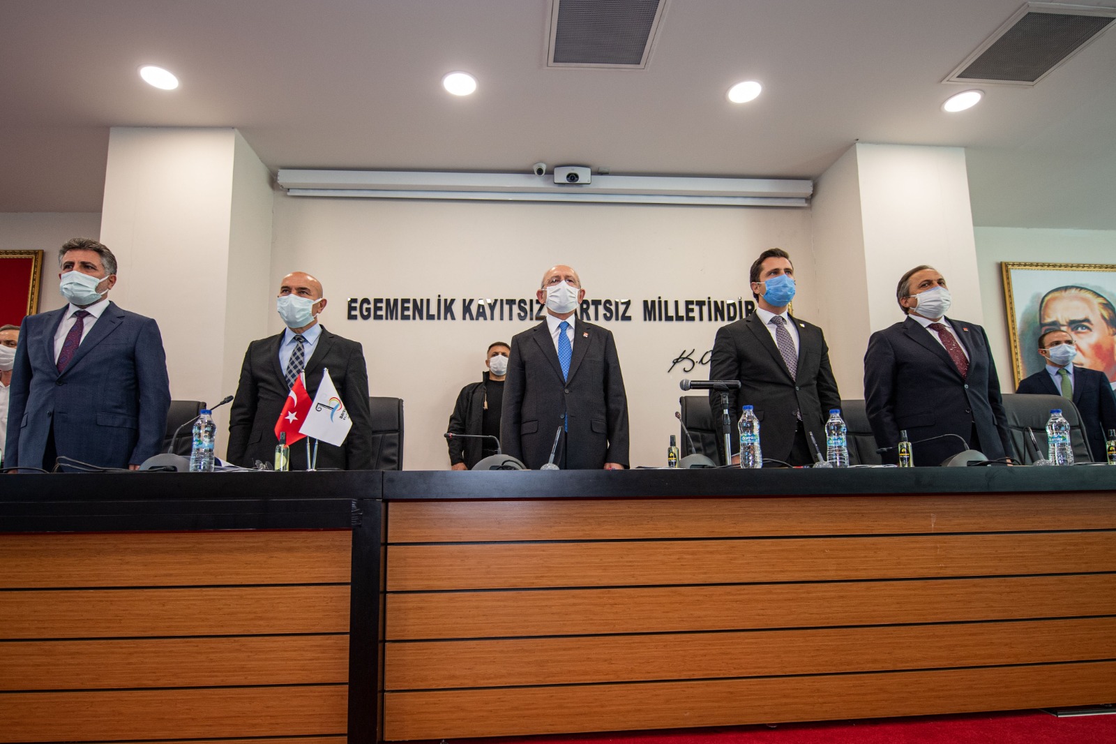Meclis Salonu’ndaki toplantıya CHP Genel Başkan Yardımcısı Seyit Torun, CHP Genel Sekreteri Selin Sayek Böke, İzmir Büyükşehir Belediye Başkanı Tunç Soyer, CHP İl Başkanı Deniz Yücel, CHP Parti Meclisi Üyeleri, ilçe belediye başkanları katıldı.