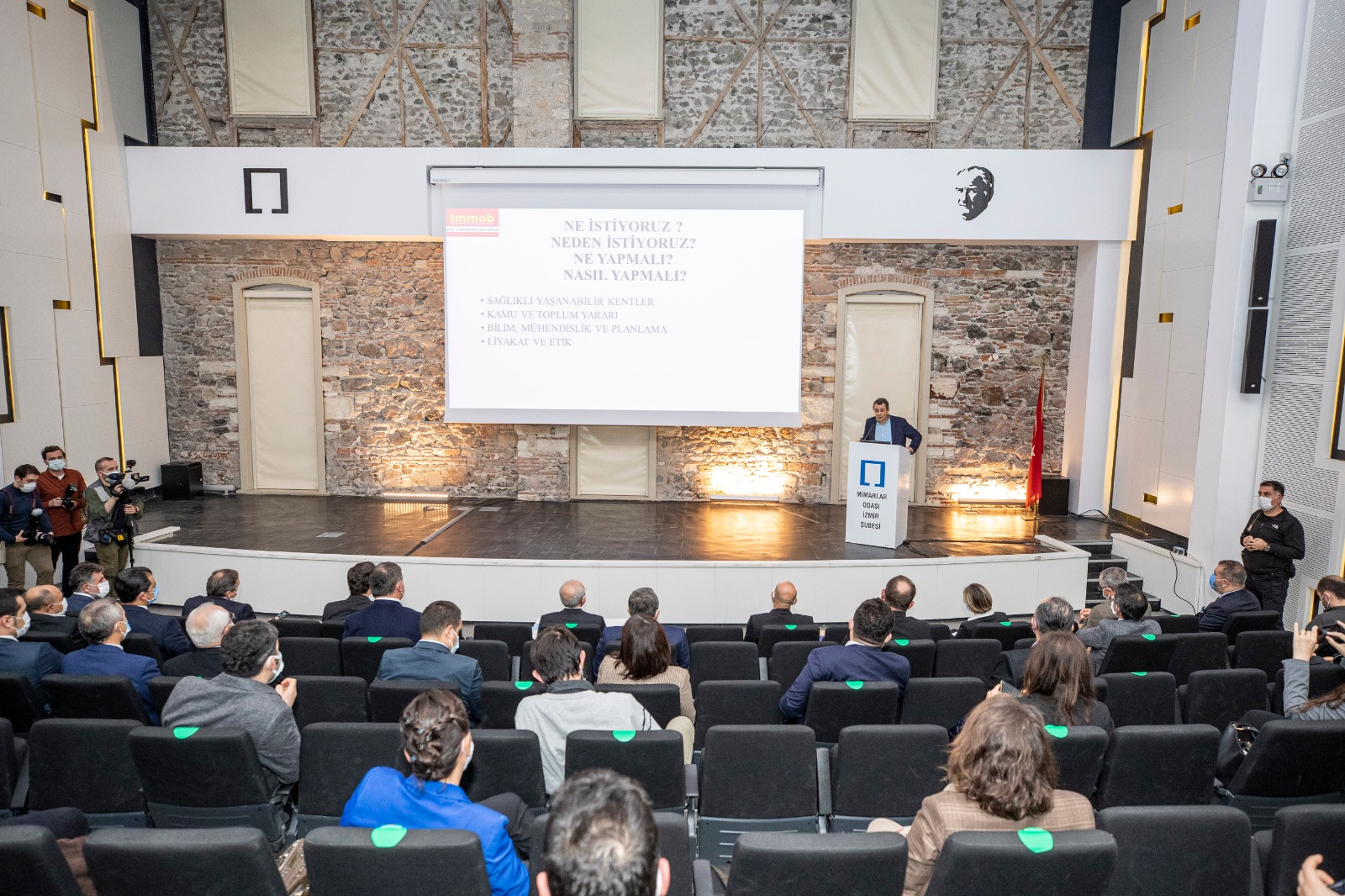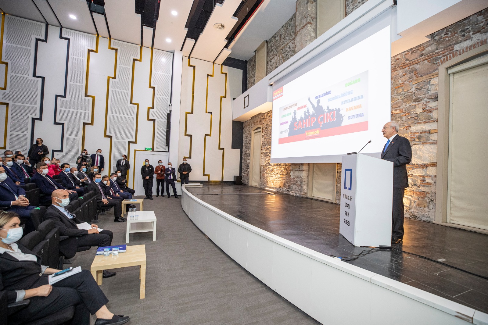 Yaptığı konuşmada İzmir’in doğası ve tarihinin korunması gerektiğini ifade eden Kılıçdaroğlu, bu noktada uzman olan meslek odalarına önemli görevlerin düştüğünü belirtti. CHP Genel Başkanı Kemal Kılıçdaroğlu, “Bir kent nasıl olmalı, nereye yüksek bina, nereye mütevazi bina yapılmalı? Tarihi eserler nasıl korunmalı? SİT alanları nasıl korunmalı? Gelecek kuşaklara bizim vaadimiz ne olmalı? Bunları yapacak olanlar mimar ve mühendisler” dedi.