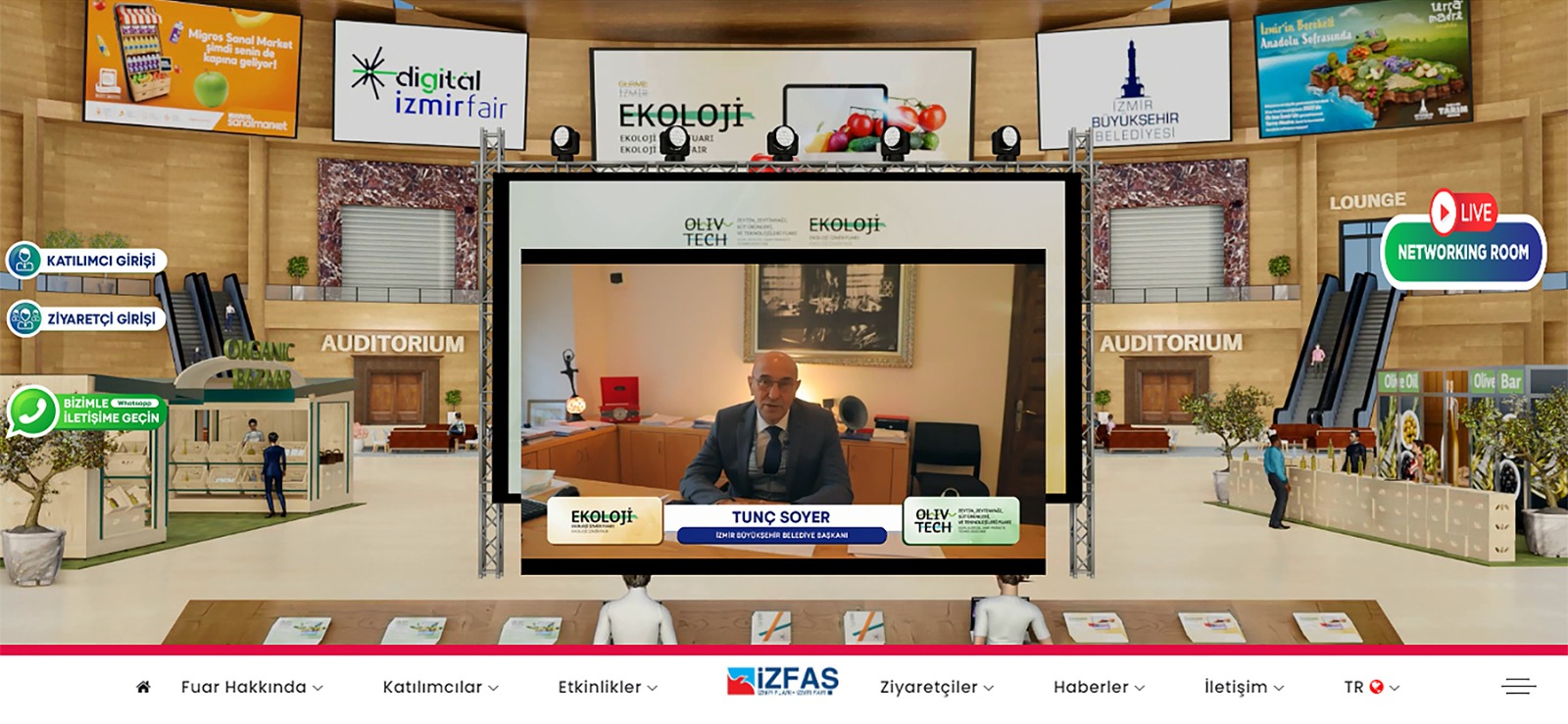 Pandemi nedeniyle yapılamayan fuarları Türkiye’de ilk defa tam zamanlı olarak hayata geçen “Dijital İzmir Fair” ile dijital ortama taşıyan İZFAŞ, açılışı Olivtech – Zeytin, Zeytinyağı, Süt Ürünleri ve Teknolojileri Fuarı ile Ekoloji İzmir Organik Sertifikalı Ürünler Fuarı ile yaptı. Gazeteci – Yazar Ali Ekber Yıldırım moderatörlüğündeki açılışa İzmir Büyükşehir Belediye Başkanı Tunç Soyer, Ege İhracatçı Birlikleri (EİB) Koordinatör Başkanı Jak Eskinazi, İzmir Ticaret Borsası (İTB) Yönetim Kurulu Başkanı Işınsu Kestelli, TV Programcısı Ayhan Sicimoğlu katıldı. Pandemi sürecinde fuarcılığı anlatan Başkan Soyer, “Olivtech ve Ekoloji İzmir Fuarı’nda fuarcılık sektöründe yine bir ilki daha başarmanın, İZFAŞ’ın kendi dijital altyapısıyla ilk sanal fuarını açmasının gururunu yaşıyoruz. Pandemi, ulusal ve uluslararası ticaretin en yoğun gerçekleştiği alanların başında gelen fuarcılığı da olumsuz etkiledi. Fuarcılığın yeni bir yapılanmaya girmesi gerektiğini fark ederek sektöre dijital yatırım yaptık. İktisat Kongresi ile başlayan fuarcılık kültüründe Türkiye’nin öncü şehri olan İzmir’de yine bir ilke imza atarak İZFAŞ’ın kendi dijital altyapısıyla fuarları dijital ortama taşıyoruz” dedi.