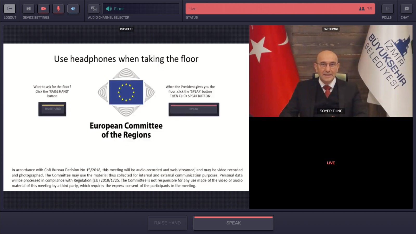Avrupa Birliği Bölgeler Komitesi’nin çevrim içi toplantısında konuşan İzmir Büyükşehir Belediye Başkanı Tunç Soyer, politika geliştirirken ve geliştirilen politikaları uygularken kentlerin rolünü arttırmayı önererek dayanışma ve yaşam hakkına saygının dirençli kentler için önemini anlattı.