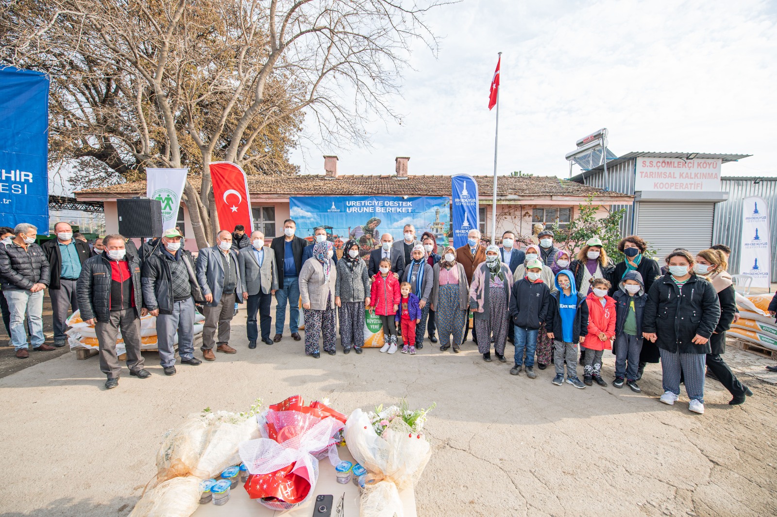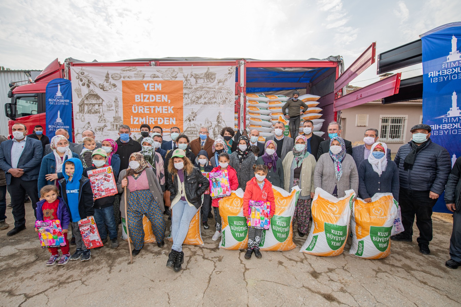 Bölgenin kadim üretim kültürü olan küçükbaş hayvancılığı havzada yeniden yaygınlaştırmayı hedeflediklerini belirten Başkan Tunç Soyer, “Hem girdi maliyetine destek olacak hem de yörenin et ve süt potansiyelini daha verimli değerlendireceğiz. Bölgede bir süt işleme tesisi ve mandıra kuruyoruz. Mandıra ve kavurma tesisi ile beraber bölgede çok ciddi etki yaratacağına inanıyoruz. Bugün kuzu büyütme yemini dağıttıktan sonra üreticilerimizden bir şey isteyeceğiz. Büyüttüğünüz kuzu ve keçilerinizi Büyükşehir Belediyesi’ne satın. Çünkü biz kavurma yapacağız. Yavru ile başlayan, sonunda et görmemiş mutfaklara uzanan bir zinciri sizlerle beraber kuracağız. Yemleri dağıttıktan üç ay sonra kuzuları satın alıp, kavurma yaparak ihtiyaç sahibi vatandaşları etle buluşturacağız” dedi.