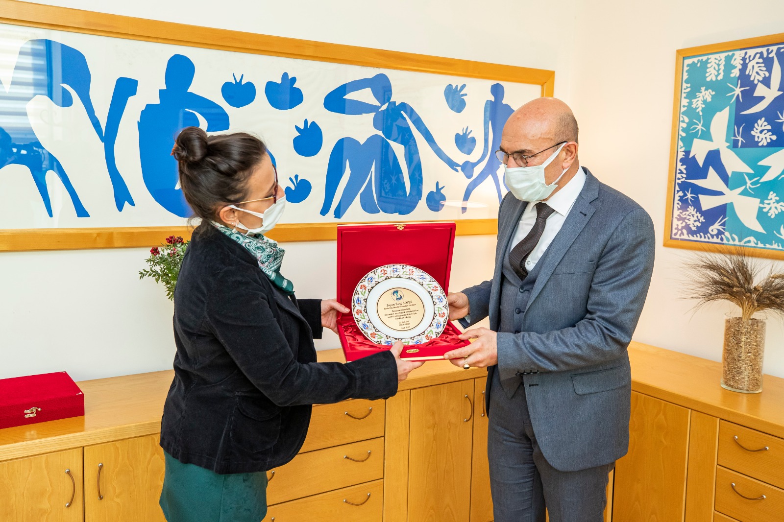 SES yöneticileri Başkan Soyer'e teşekkür plaketi ile üzerinde pandemiyle mücadele ederken hayatını kaybeden sağlıkçıların fotoğraflarının yer aldığı masa takvimini verdi.