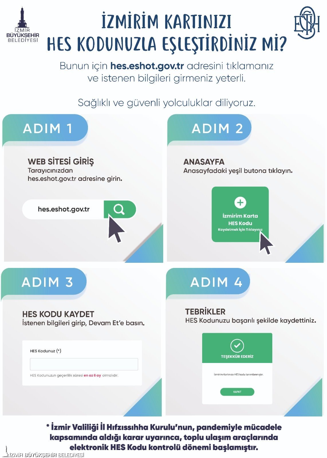 İzmir Valiliği İl Hıfzıssıhha Kurulu’nun pandemiyle mücadele kapsamında aldığı karar gereğince; kent içi toplu ulaşım araçlarına binişte HES Kodu tanımlanmış İzmirim Kartların kullanılması uygulaması 11 Ocak Pazartesi günü itibariyle başladı. Aktif kullanılan İzmirim Kartların yüzde 85’ten fazlasına tanımlama işleminin yapıldığı görüldü. İzmir Büyükşehir Belediyesi, işlemi henüz gerçekleştirmeyen vatandaşlara, “Mağduriyet yaşamamak için İzmirim Kartınız ile HES kodunuzu eşleştirin” çağrısı yaptı.