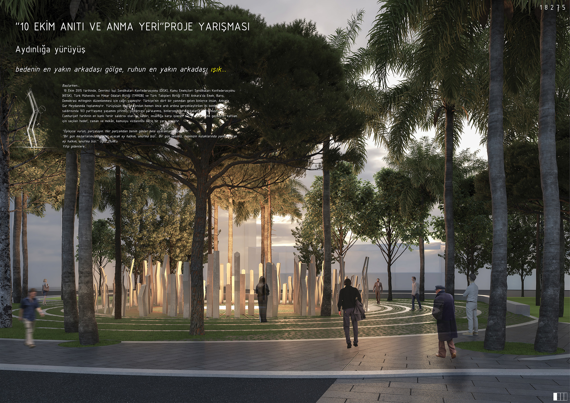 İzmir Büyükşehir Belediyesi’nin 10 Ekim Ankara Gar katliamı ve bu katliamda hayatlarını kaybedenlerin anısına açtığı “10 Ekim Anıtı ve Anma Yeri” proje yarışması sonuçlandı. Birinci seçilen proje, “aydınlığa yürüyüş” temasıyla katliamda yaşamını yitiren 103 kişiyi merkezine alıyor.