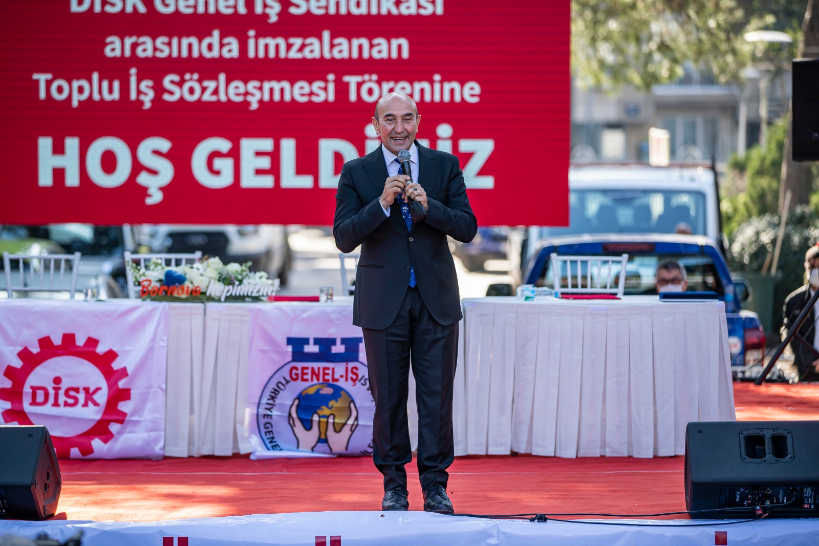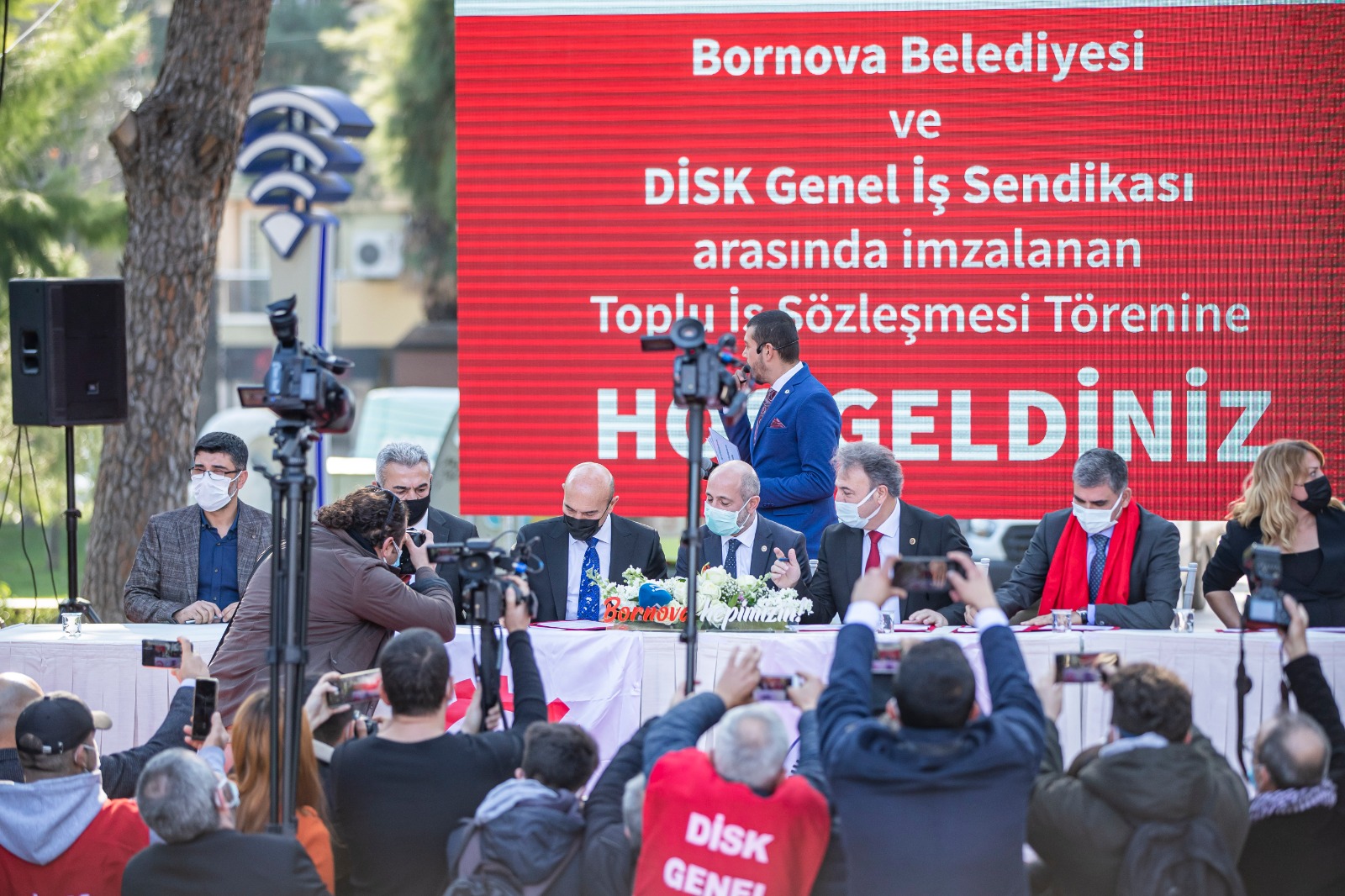 İzmir Büyükşehir Belediye Başkanı ve SODEMSEN (Sosyal Demokrat Kamu İşverenleri Sendikası) Yönetim Kurulu Başkanı Tunç Soyer, Bornova Belediyesi ile DİSK'e bağlı Genel İş Sendikası 7 No'lu Şube arasında imzalanan toplu iş sözleşmesi törenine katıldı. Bin 535 işçiyi kapsayan toplu iş sözleşmesi sonrası Bornova Belediyesi'nde asgari ücret 5 bin 890 TL oldu.