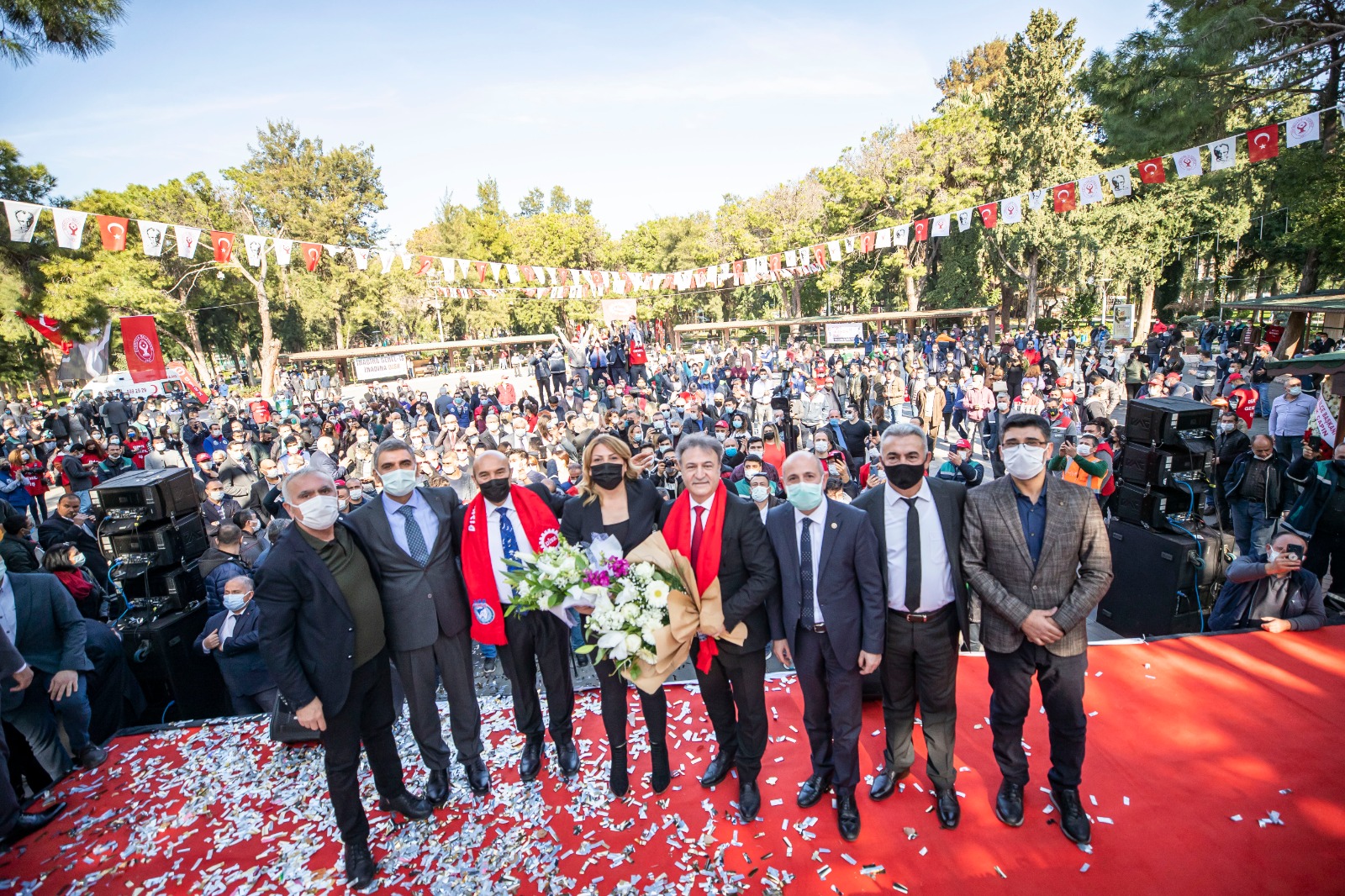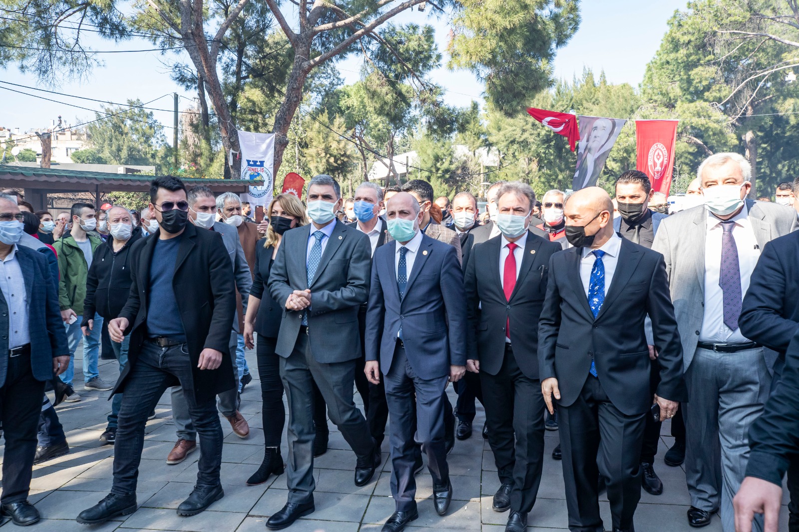 Büyük Park'taki törende konuşan Başkan Soyer, emek ve ekmek mücadelesinin demokrasi ile alakalı olduğunu vurgulayarak, "Emek mücadelesi bir sözleşme ile bitecek bir mücadele değildir. Emek mücadelesi 'eşit işe eşit ücret' ve birçok kriterle beraber yürümesi gereken bir süreç. Hep daha iyisi ve daha fazlası mümkündür. Çünkü söz konusu olan alın teridir, emektir. Burada emek ve ekmek mücadelesinin demokrasi ile alakalı olduğunu öğrenmemiz ve öğretmemiz lazım. Bir memlekette demokrasi ne kadar azalırsa ekmek o kadar küçülür. Demokrasi artarsa ekmek o kadar büyür. Bunun da bir sırrı var. Yaşasın örgütlü mücadelemiz! Kurtuluş yok tek başına ya hep beraber ya hiç birimiz!" diye konuştu.