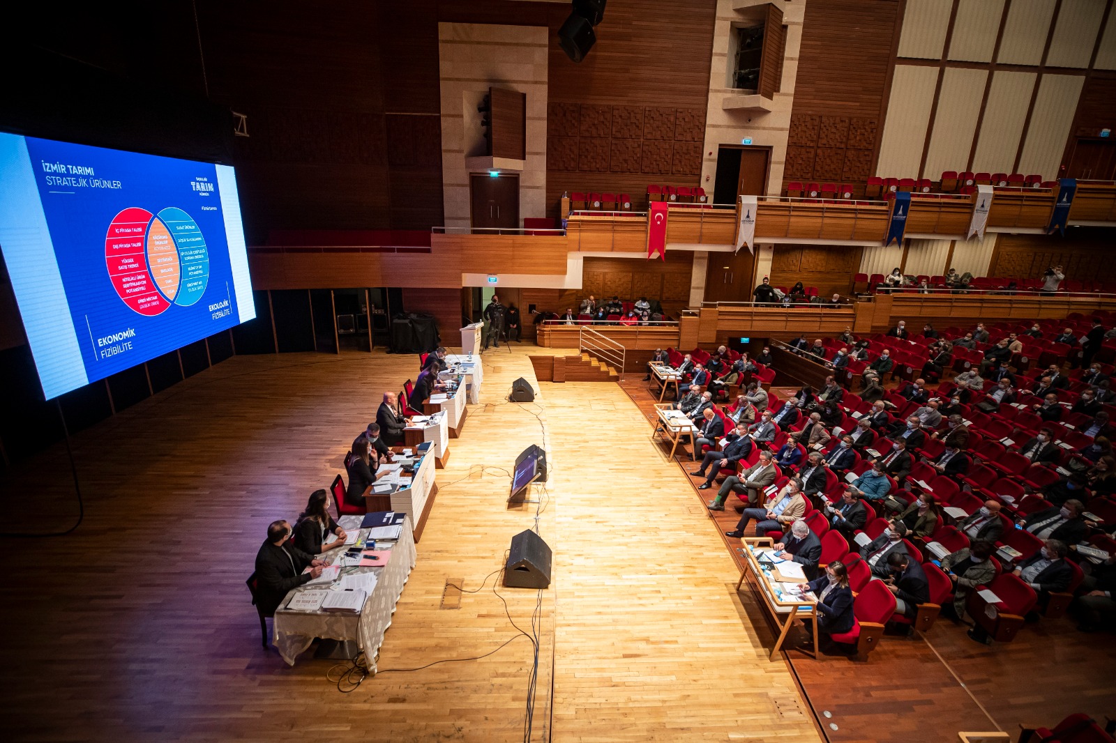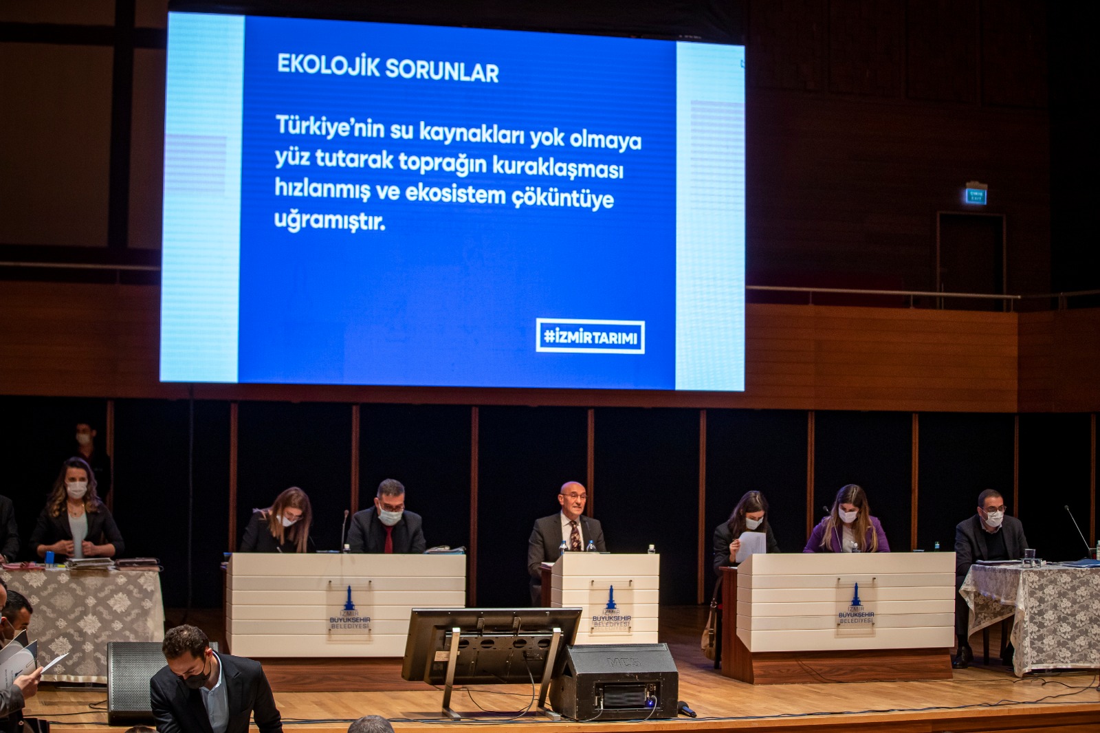 Başkan Tunç Soyer, 21 Ocak’ta Ödemiş’te açıkladığı İzmir Tarımı ile ilgili Meclis üyelerine sunum da yaptı. “Başka bir tarım mümkün” felsefesinden doğan İzmir’in yeni tarım ekonomisi modelinin temel dayanaklarını aktaran Soyer, “İzmir Tarımı şehrimizden başlayarak yeni ve farklı bir tarım ekonomisi inşa etme projesidir” dedi. İzmir Tarımı’nın kuraklıkla ve yoksullukla mücadele üzerinde temellendiği aktaran Soyer, Meclis üyelerine İzmir Tarımı’nın sözcüsü olmaları için çağrı yaptı. “Bunu İzmir Büyükşehir Belediye Başkanı olarak değil bu memleketin evladı olarak söylüyorum” diyen Soyer, sözlerini şöyle sürdürdü: “İzmir Tarımı, Türkiye’nin refahını artırmak ve adil paylaştırmak için attığımız çok önemli bir adım. Topraklarımızı ithal tohumlara, gıda tekellerine bırakamayız. Topraklarımızı koruyan, şehrimizdeki milyonları sağlıklı gıdayla buluşturan İzmir Tarımı için tek yumruk olmalıyız. Tüm meclis üyelerine açık çağrımdır. Bu başarının altına ortak imza atmalıyız. Her meclis üyemizi İzmir Tarımı’nın sözcüsü olmaya, bu değişimi sağlamak için çalışmaya davet ediyorum. Meclis üyesi olmanın değil memleket evladı olmanın gereği olarak bu çağrıyı yapıyorum.”