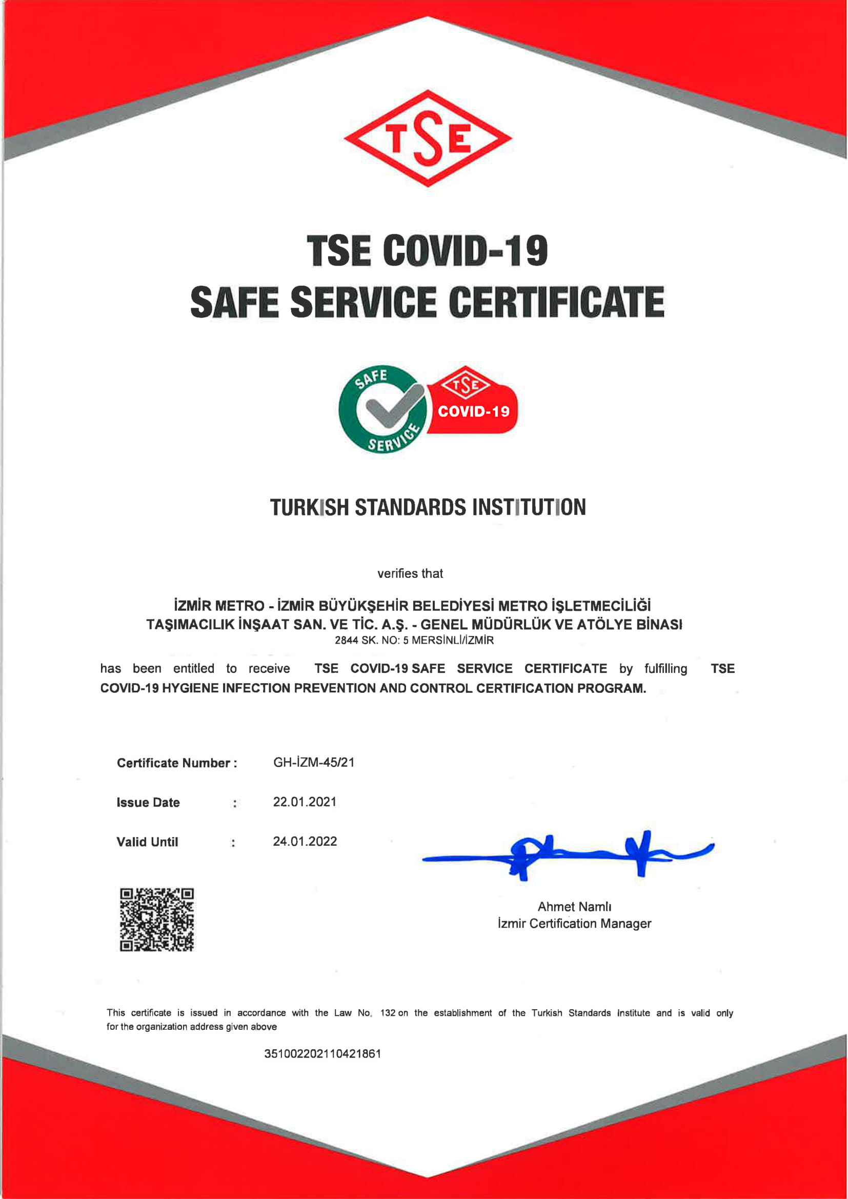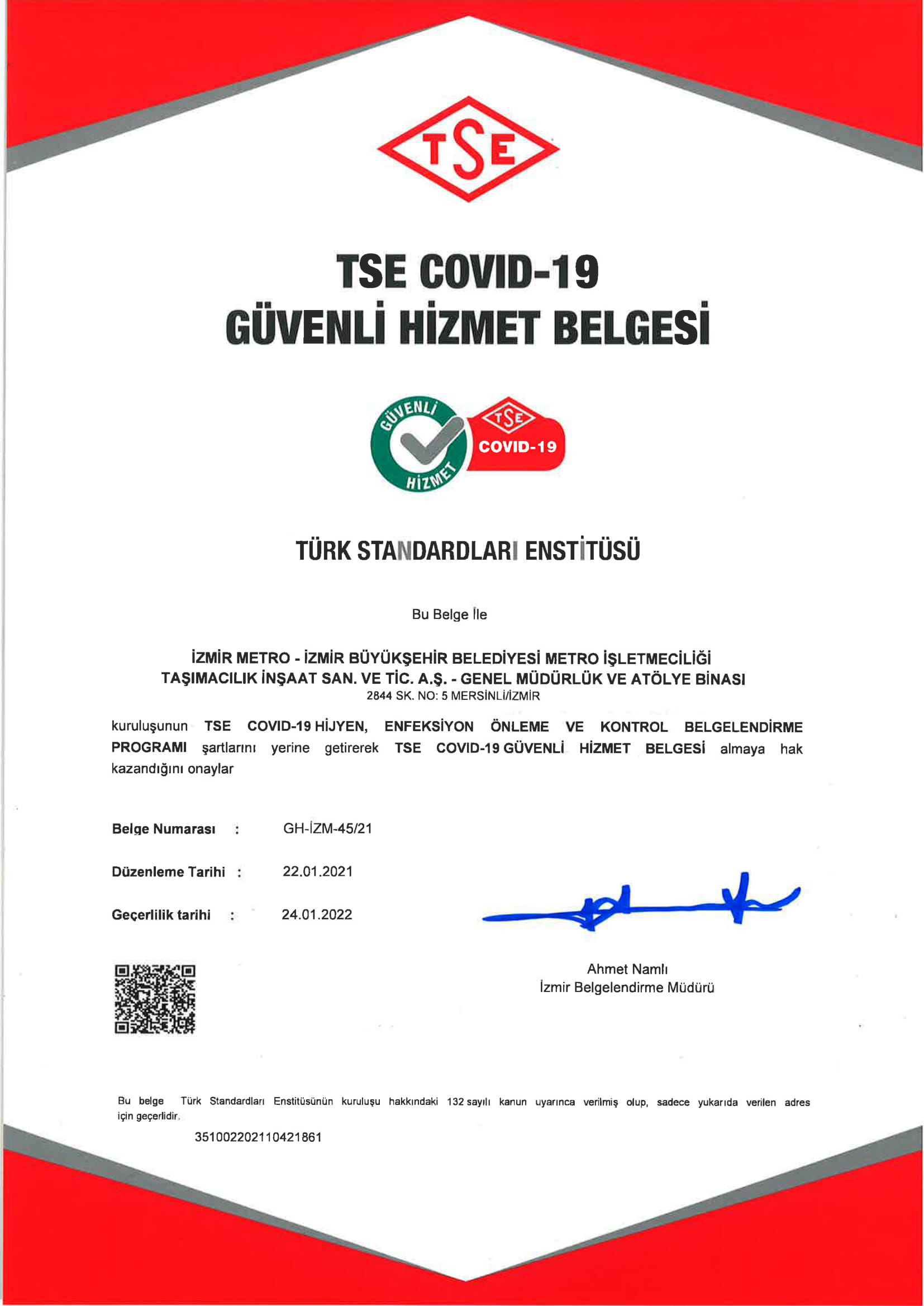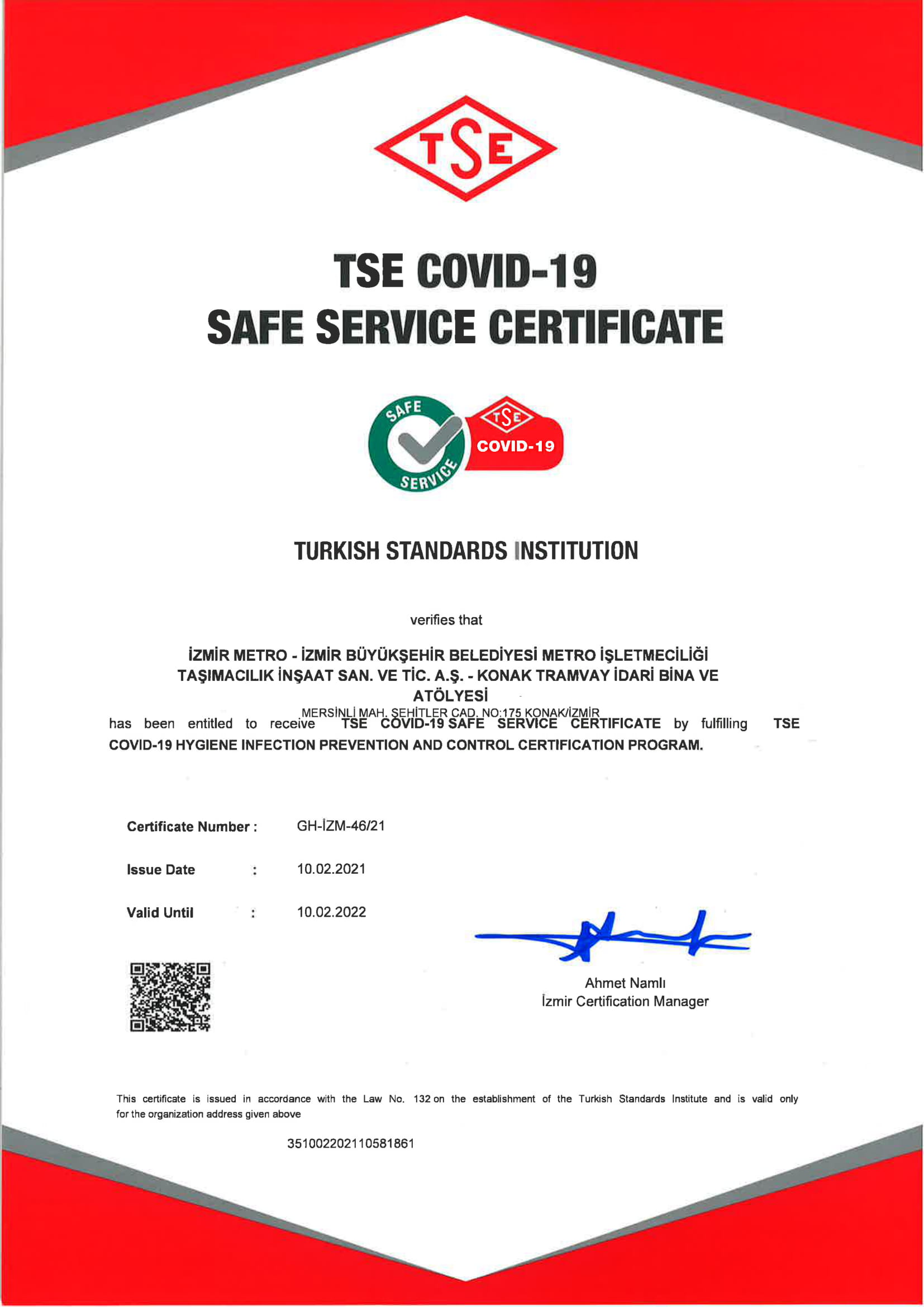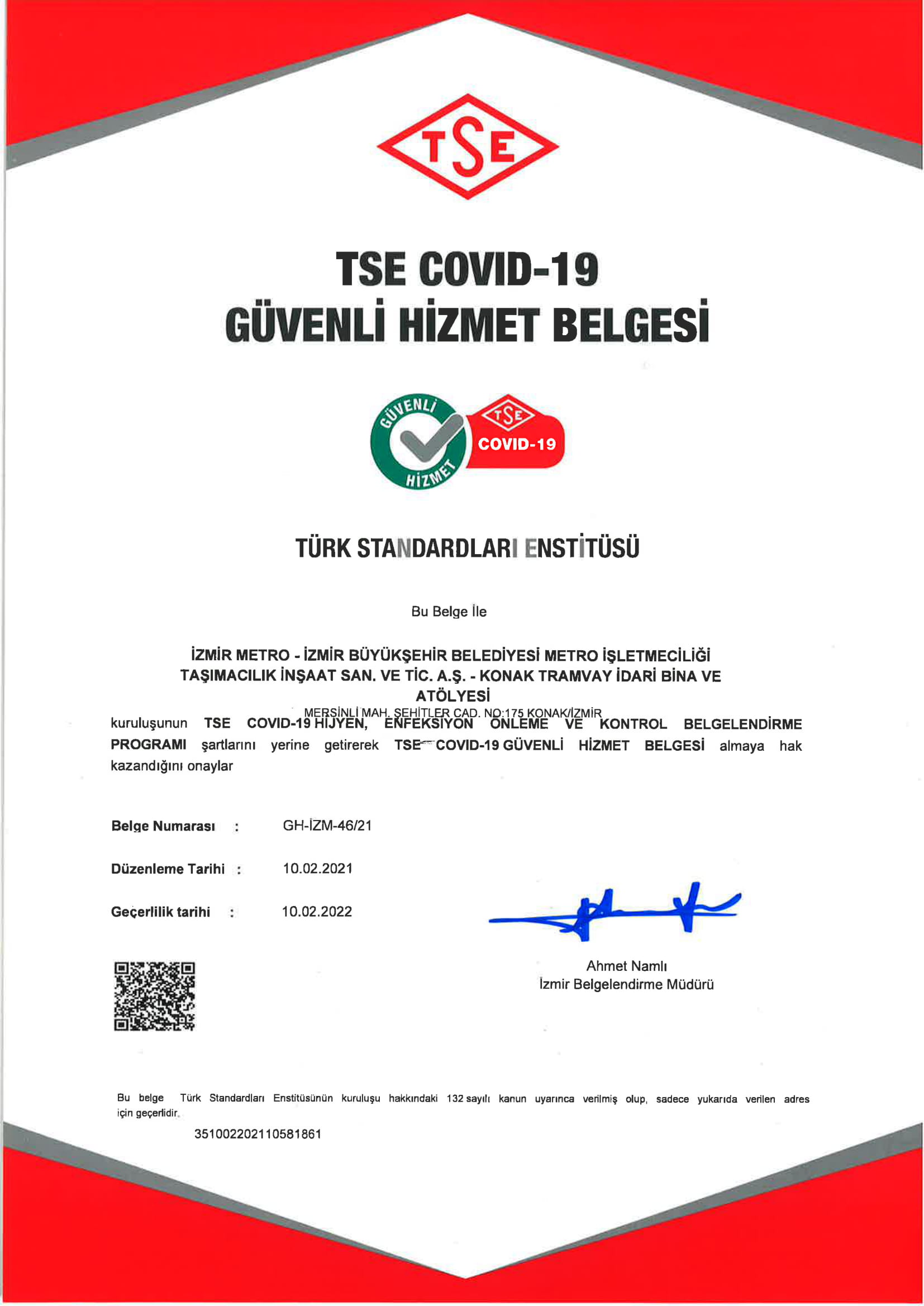 Pandemi sürecinde toplum sağlığı açısından büyük önem taşıyan tedbirleri eksiksiz uygulayan İzmir Metro A.Ş. ve İzmir Tramvayı hizmet tesislerine, Türk Standartları Enstitüsü (TSE) tarafından üç ayrı COVID-19 Güvenli Hizmet Belgesi verildi. TSE uzmanlarınca yapılan denetimler sonucunda; Metro, Karşıyaka ve Konak Tramvayları merkez binaları ile atölyeleri, Türkiye’de kamusal toplu ulaşım hizmeti alanında belgelendirilen ilk kuruluşlardan olmaya hak kazandı.
