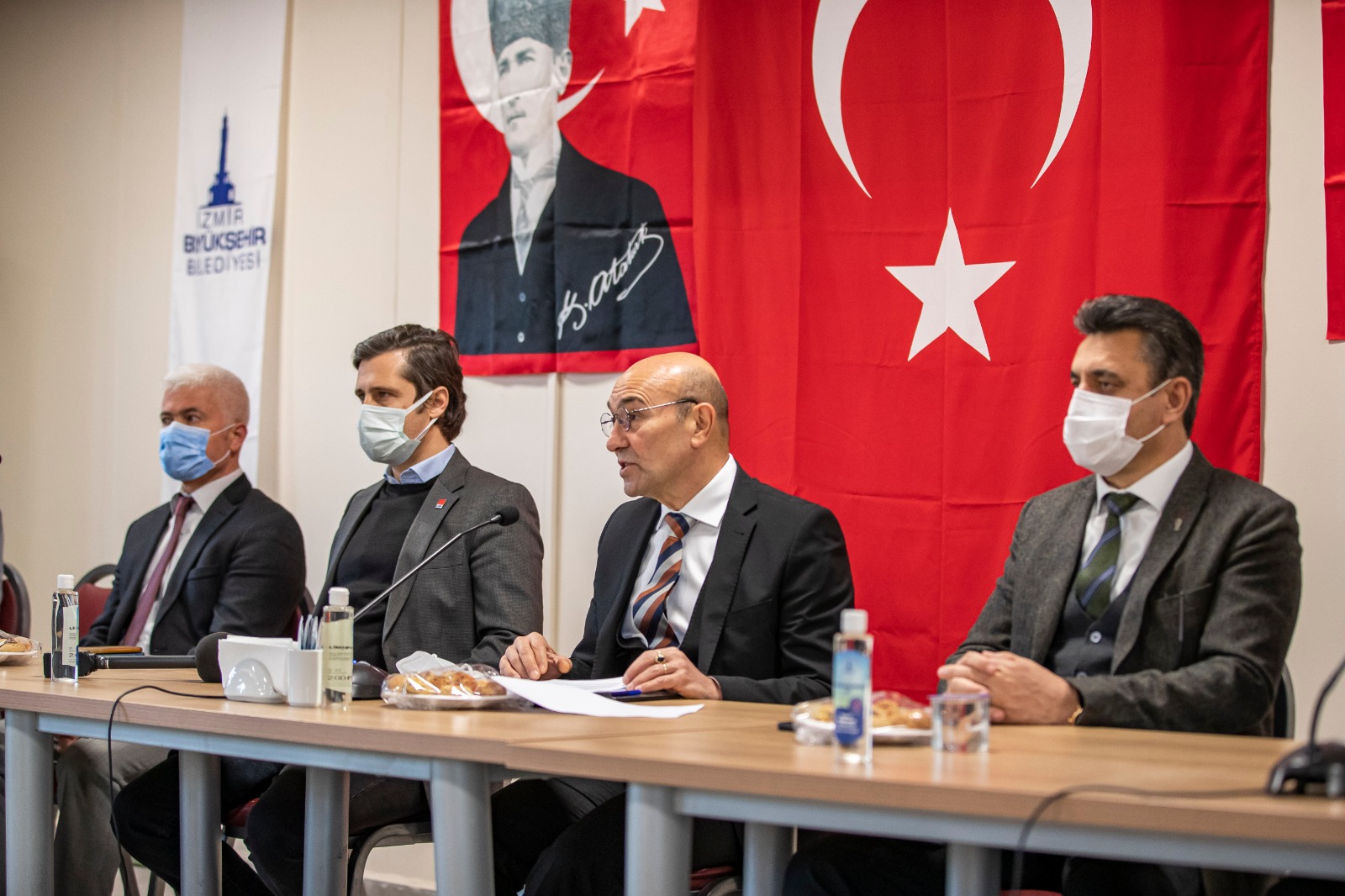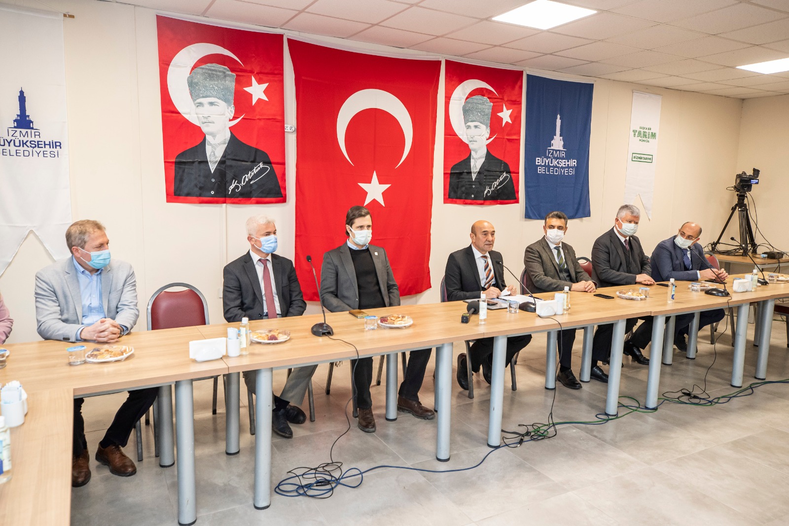 Başkan Soyer'in İZBETON şantiyesi toplantı salonunda yaptığı basın toplantısına eşi ve İzmir Köy Koop Birlik Başkanı Neptün Soyer, Dikili Belediye Başkanı Adil Kırgöz, CHP İzmir İl Başkanı Deniz Yücel, CHP Bergama İlçe Başkanı Mehmet Ecevit Canbaz, İzmir Büyükşehir Belediye Başkan Vekili Mustafa Özuslu, İzmir Büyükşehir Belediyesi Genel Sekreteri Dr. Buğra Gökçe, İzmir Büyükşehir Belediyesi Genel Sekreter yardımcıları Ertuğrul Tugay, Eser Atak, Yıldız Devran, Ertuğrul Tugay, Barış Karcı, Suphi Şahin, Bergama Belediyesi meclis üyeleri, belediye bürokratları, muhtarlar ve basın mensupları katıldı.