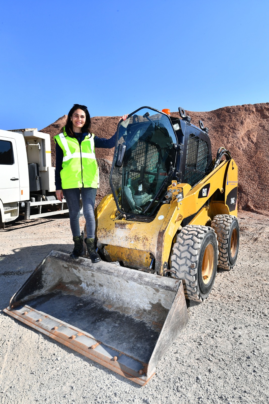 İlknur Özyalçın, Fen İşleri Şantiye Şube Müdürlüğü bünyesindeki kaldırım ve yol altyapı malzemeleri serim işinde “mini loader” ve kepçe operatörü olarak çalışıyor.
