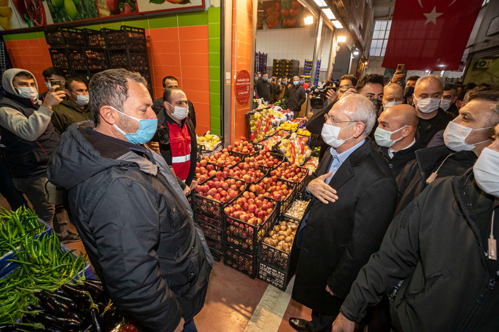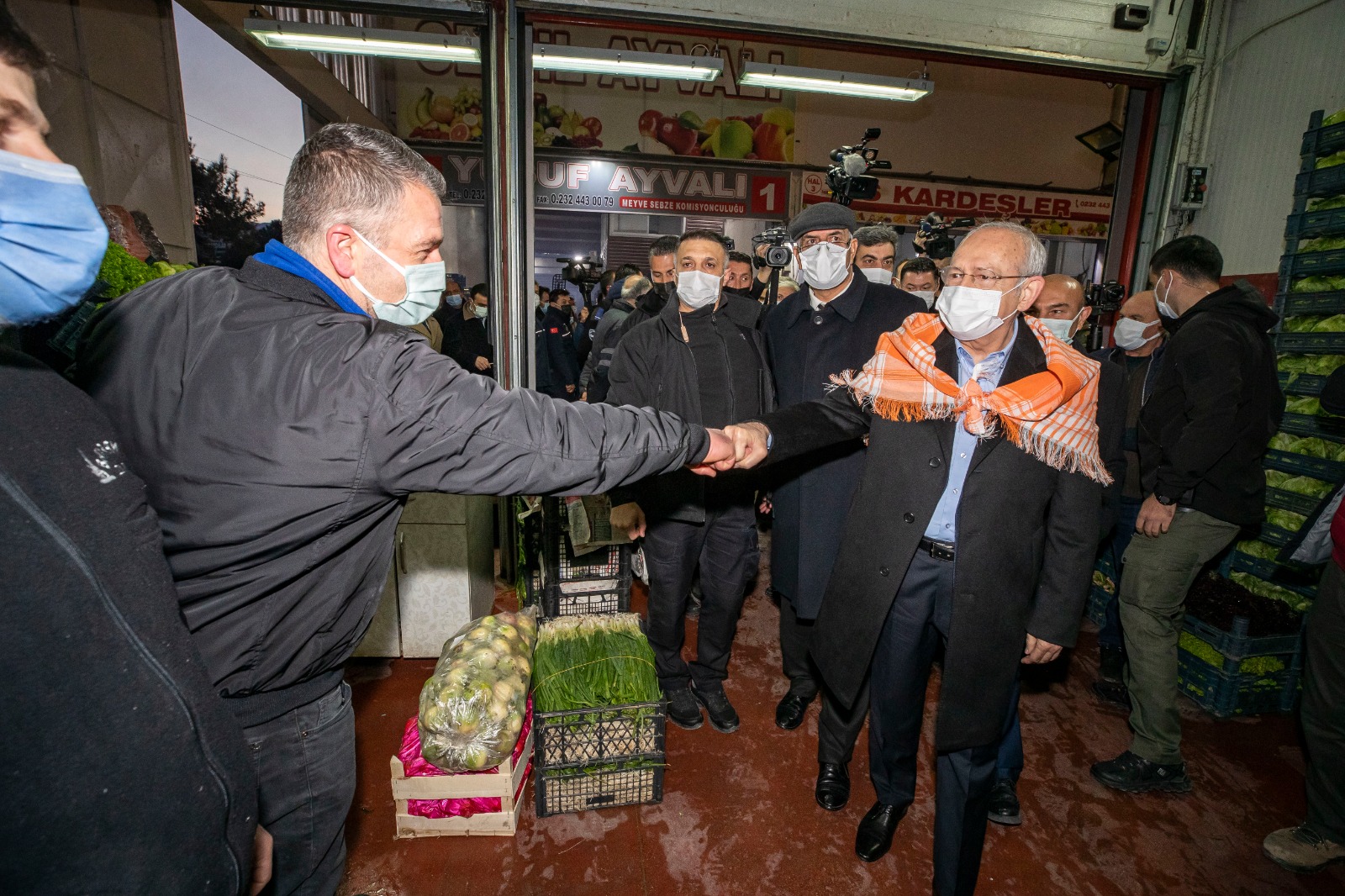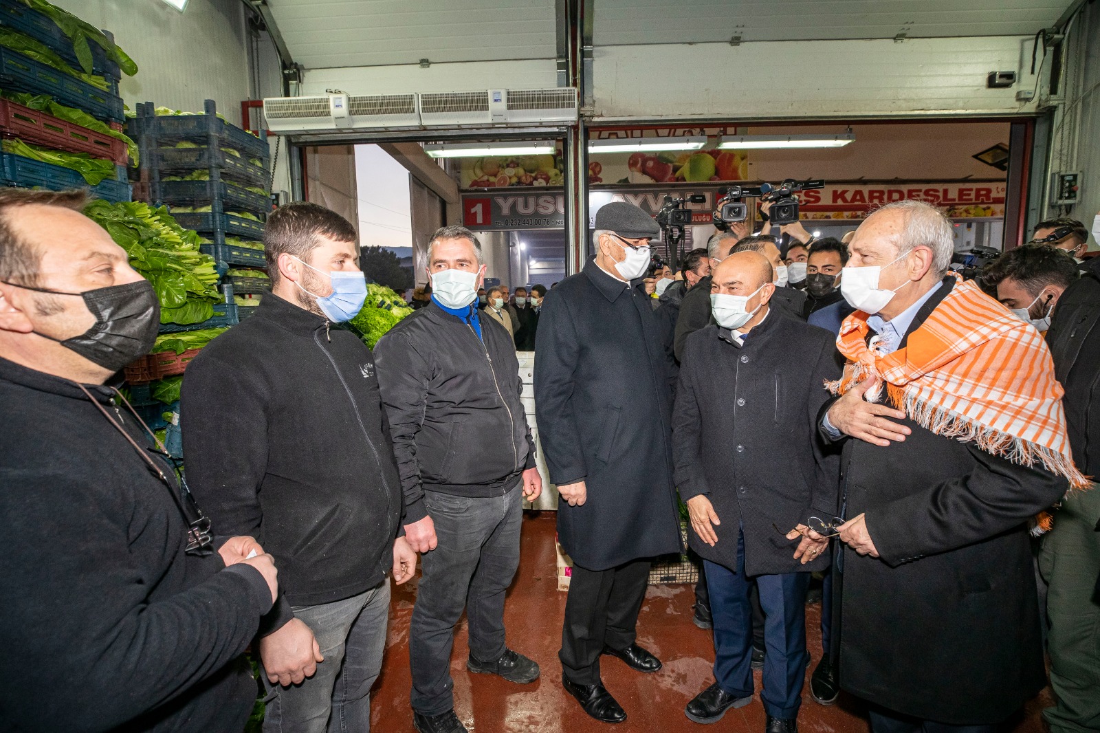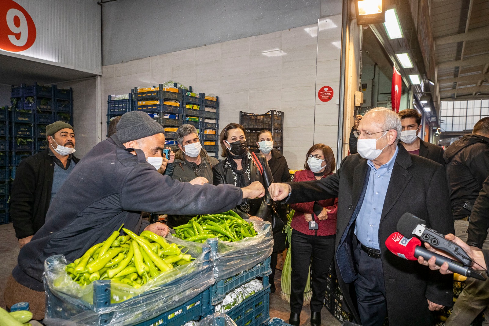 Cumhuriyet Halk Partisi (CHP) Genel Başkanı Kemal Kılıçdaroğlu, İzmir programı kapsamında güne İzmir Büyükşehir Belediyesi’ne bağlı Sebze ve Meyve Hali’nde başladı. Büyükşehir Belediye Başkanı Tunç Soyer ile birlikte esnafın sorunlarını dinleyen Kılıçdaroğlu, esnafa seslerinin duyurulması için destek sözü verdi.