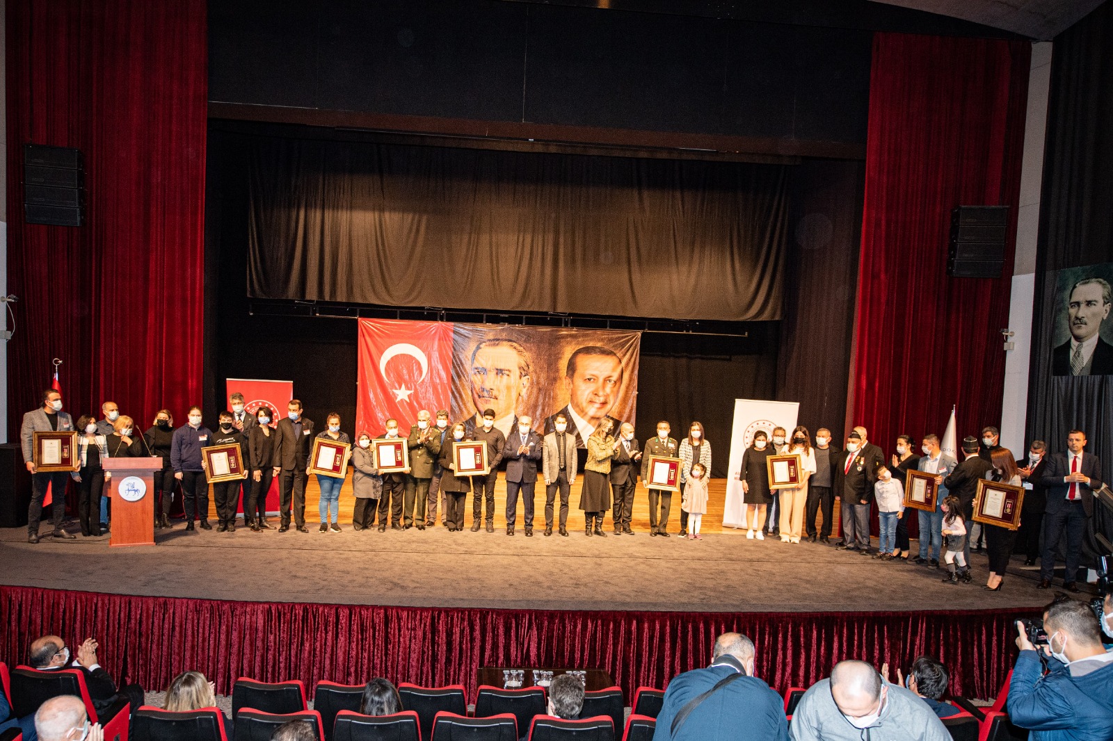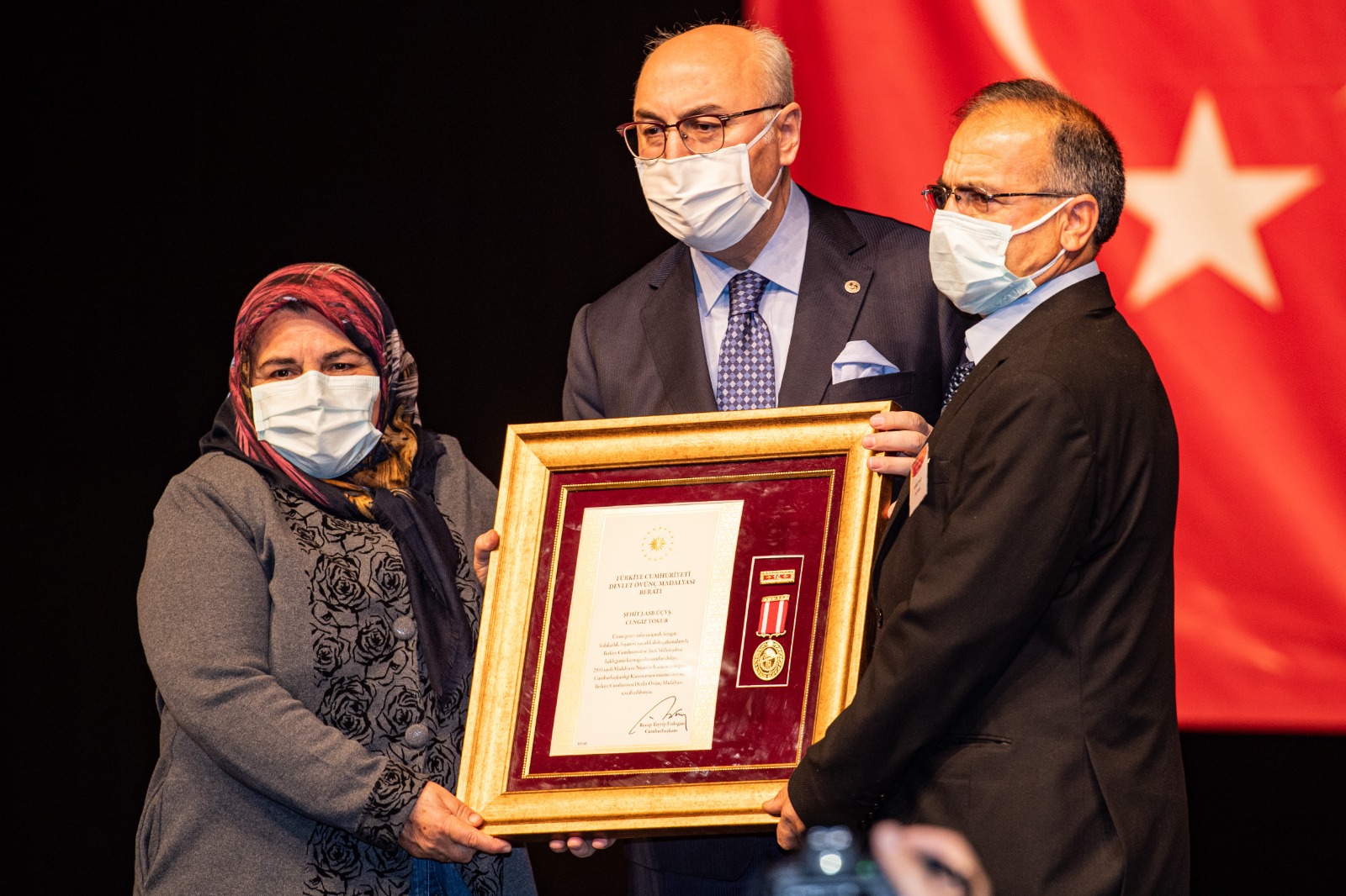 Şehit Jandarma Yarbay Zafer Akkuş, Şehit Tankçı Teğmen Ali Emre Fırıncıoğulları, Şehit Hava Piyade Astsubay Üstçavuş Uğur Görkem Harmankaya, Şehit Jandarma Astsubay Üstçavuş Cengiz Tokur, Şehit Jandarma Astsubay Kıdemli Çavuş Uğur Palancı, Şehit Jandarma V. Kademeli Çavuş Kemal Sayar, Şehit Jandarma Uzman Çavuş Muhammed Ferdi Güntekin’in yakınları ile Malul Piyade Astsubay Üstçavuş Koray Bayrak, Malul Piyade Astsubay Kıdemli Çavuş Muammer Filiz ve Malul Piyade Yüzbaşı Onur Özdoğan’a Devlet Övünç Madalyası Rozet ve Beratı Vali Köşger tarafından verildi.