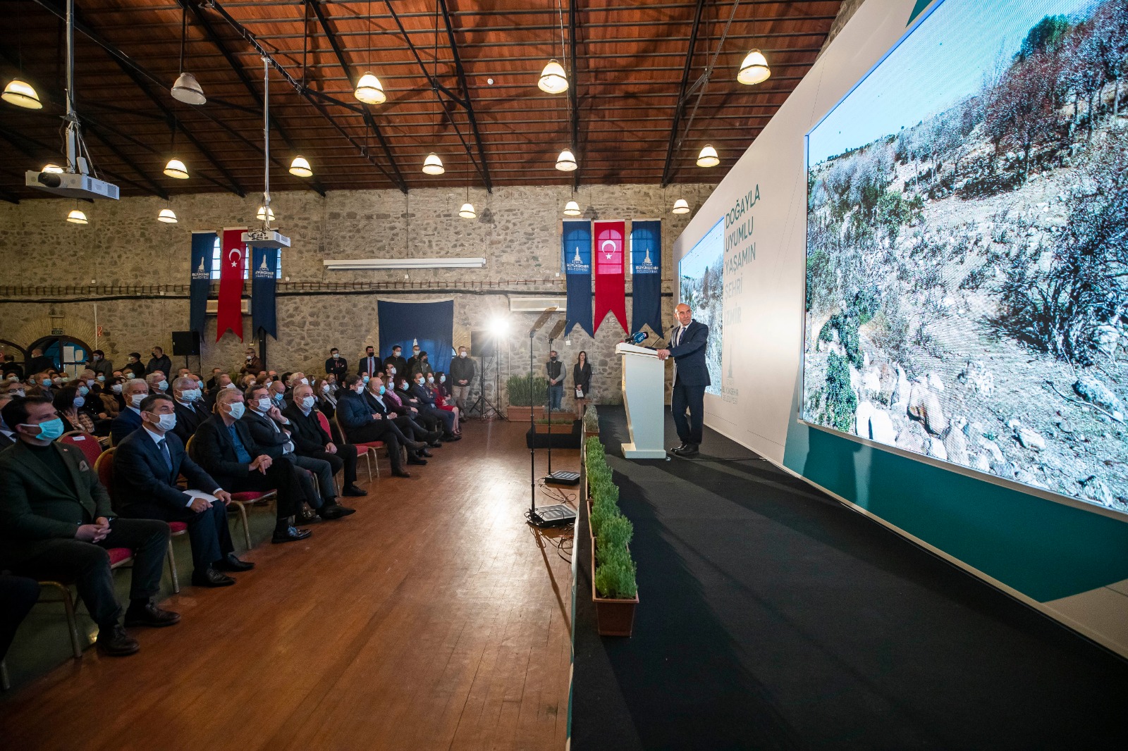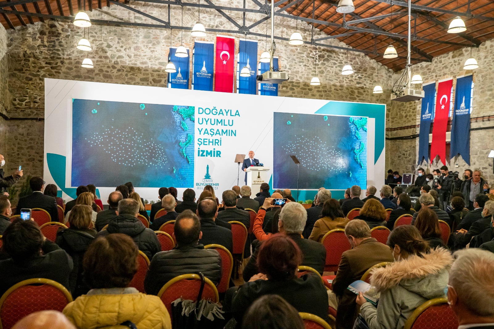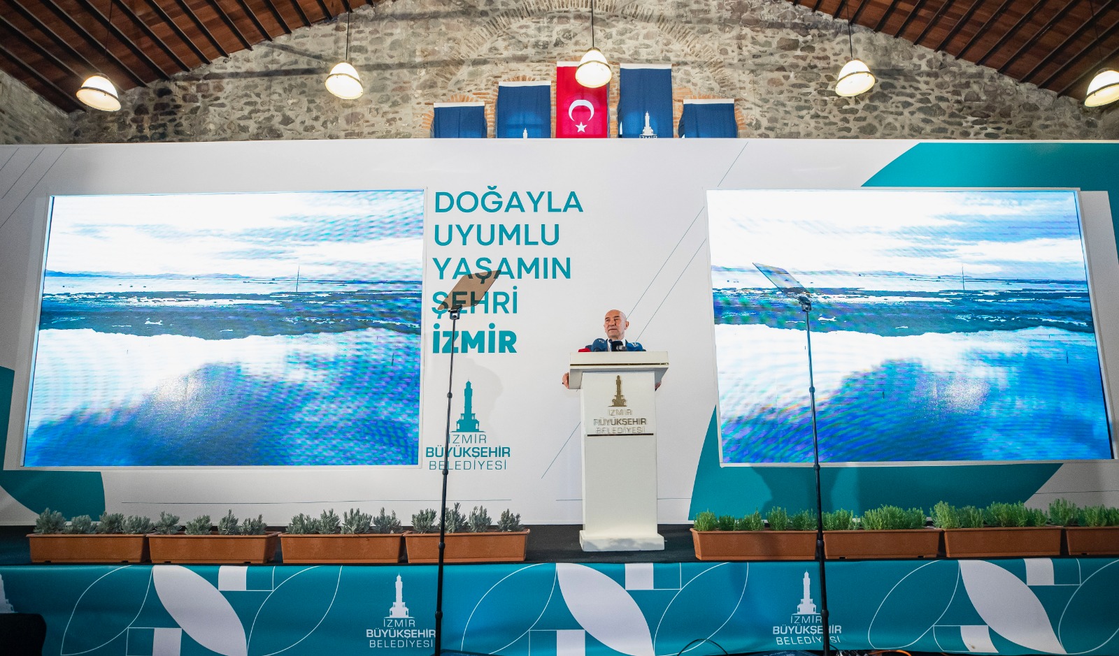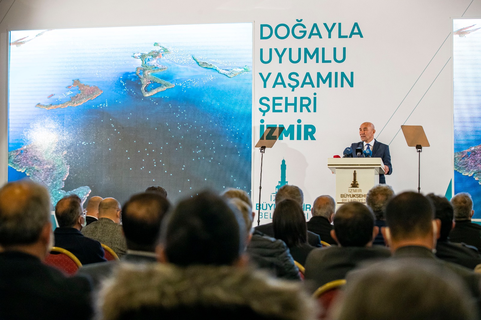 İzmir’in Doğayla Uyumlu Yaşam Stratejisi tanıtım toplantısında konuşan İzmir Büyükşehir Belediye Başkanı Tunç Soyer, iki büyük felaketin, pandemi ve iklim krizinin insanın kendisiyle ve doğasıyla yüzleşmesini sağladığını belirtti. Soyer, “İzmir’de son iki yılda pandemiyi ve doğal afetlerin hemen her türlüsünü yaşadık. Yaşadıklarımızdan çok şey öğrendik ve dirençli bir kent olmanın sırlarını araştırmaya başladık. Gördük ki, afetlere ve salgınlara dirençli olmanın tek yolu, doğayla uyumlu bir yaşam sürmek. Şehirlerimizi, doğasıyla uyumlu şekilde imar etmek” dedi.