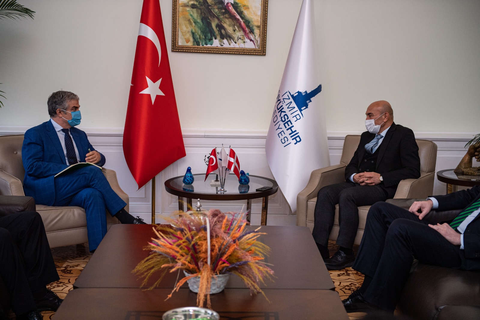 Büyükelçiyi ağırlamaktan büyük mutluluk duyduklarını söyleyen İzmir Büyükşehir Belediye Başkanı Tunç Soyer, yenilenebilir enerjinin öncelikli konuları arasında yer aldığını belirterek, “İki ülke arasındaki ticari ilişkileri güçlendirmek amacıyla İZFAŞ aracılığıyla iş günleri düzenleyebiliriz. Turizm, tarım, yenilenebilir enerji alanında işbirlikleri geliştirebiliriz. İzmir tarih boyunca tarım konusunda odak kent oldu. Biz bu potansiyeli artırmak, yeni pazarlar bulmak istiyoruz. Agro turizm konusunda çalışmalarımız var. Eylül ayında kültür zirvesi düzenleyeceğiz. Danimarka ile her zaman işbirliğine hazırız” dedi.