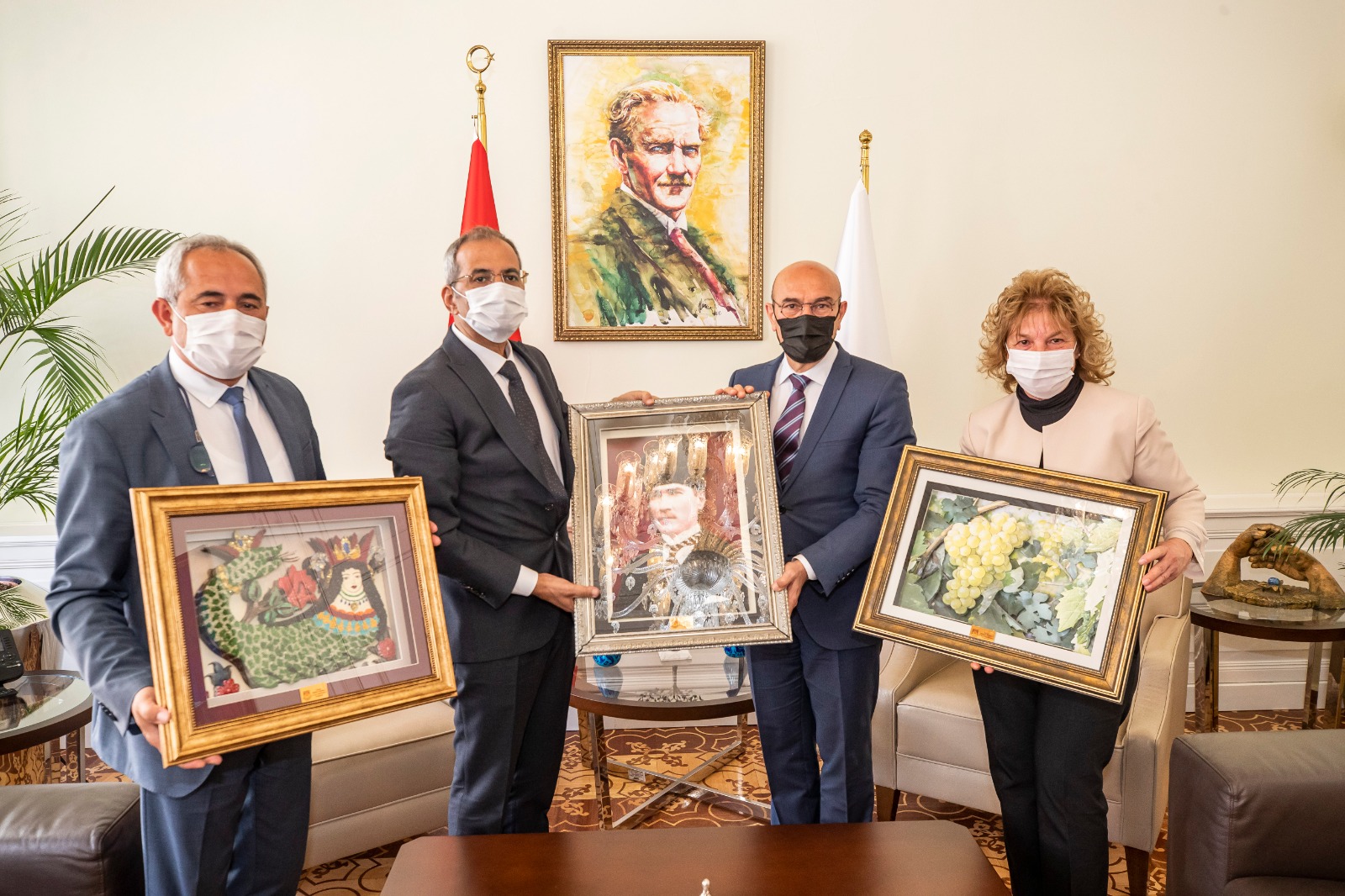 Ziyarette, İzmir Büyükşehir Belediye Başkanı Tunç Soyer de Haluk Bozdoğan'a atalık kavılca buğdayı, biberlik domates, börülce ve kavun tohumu hediye etti.
