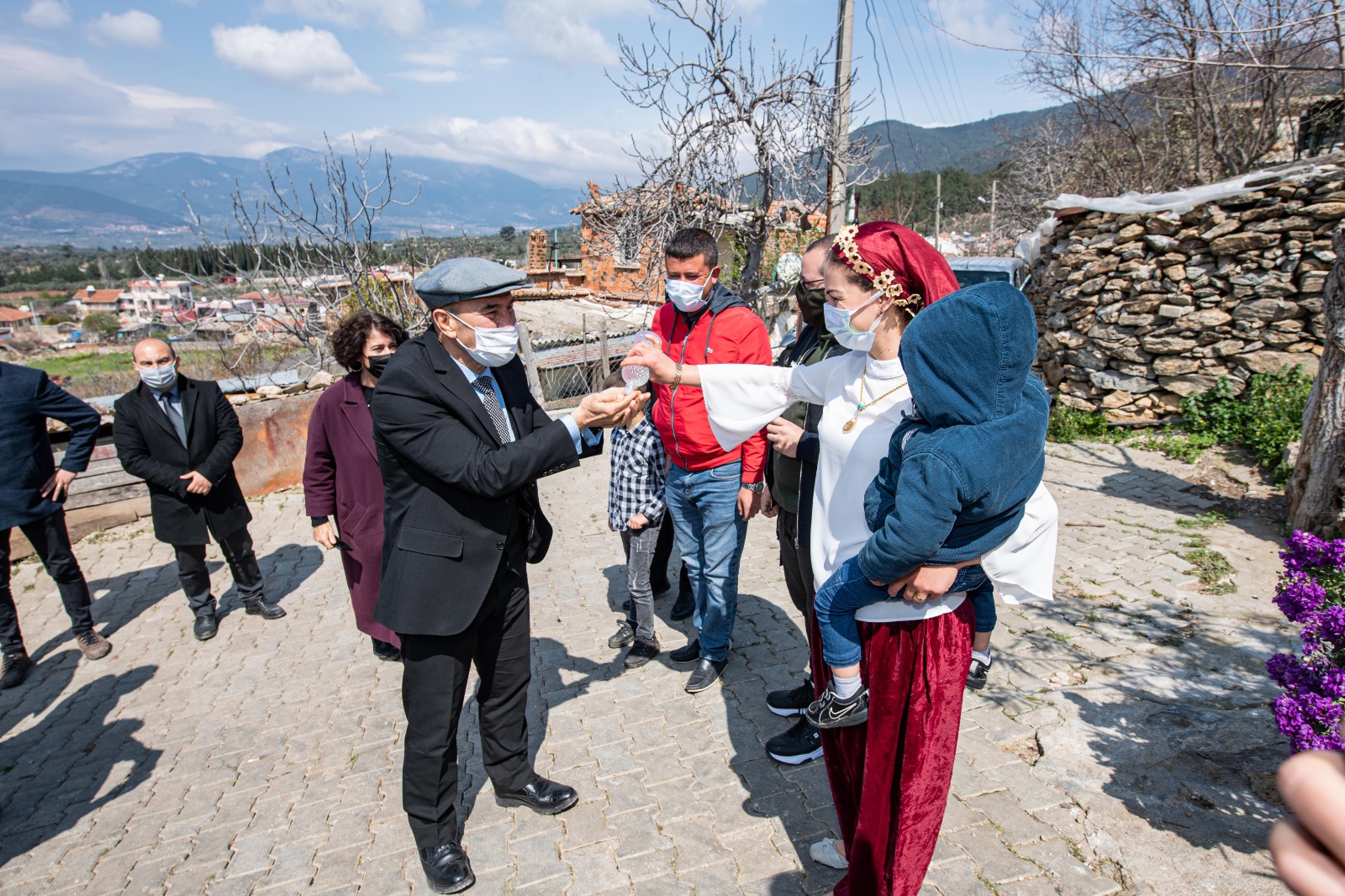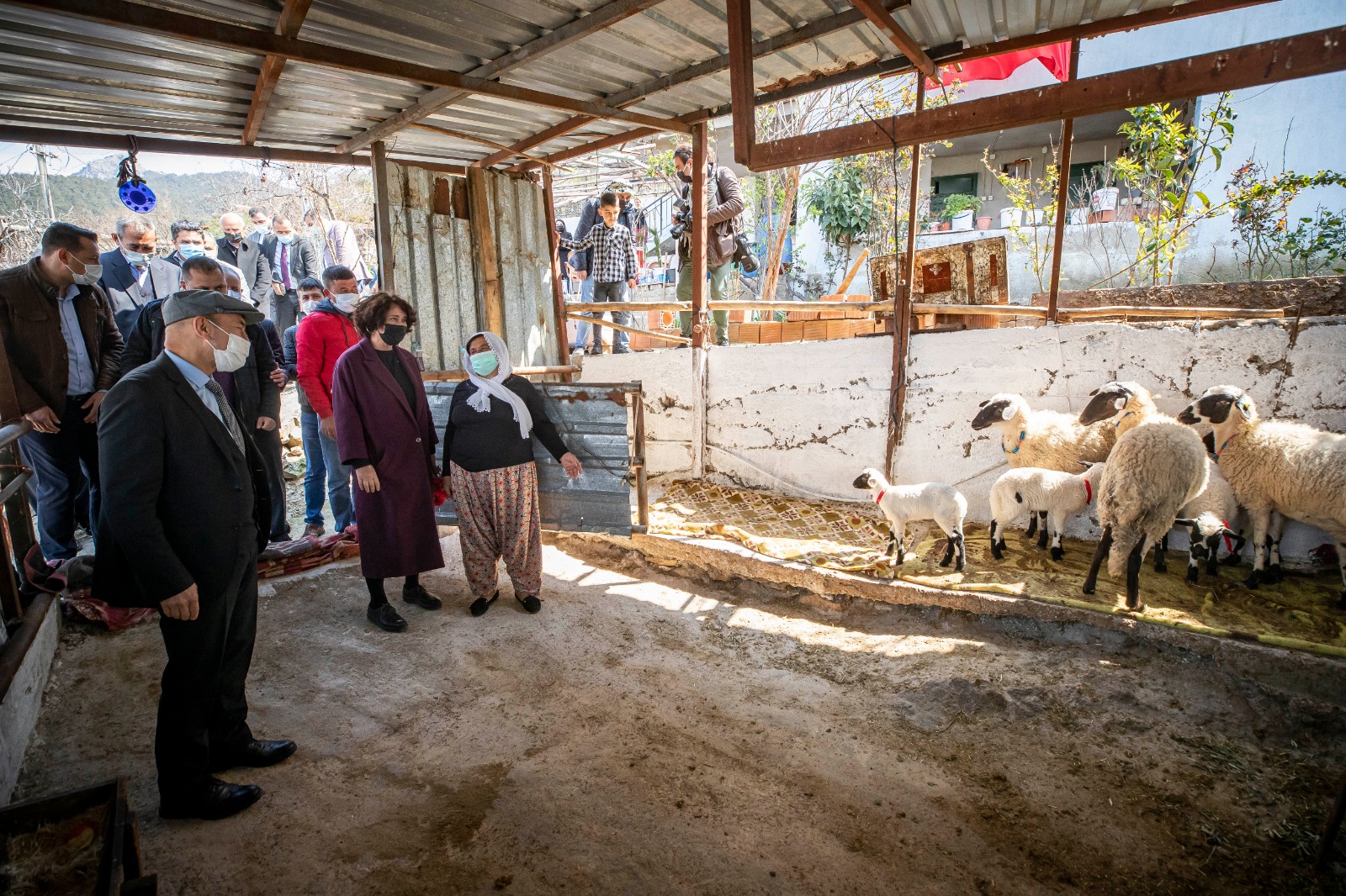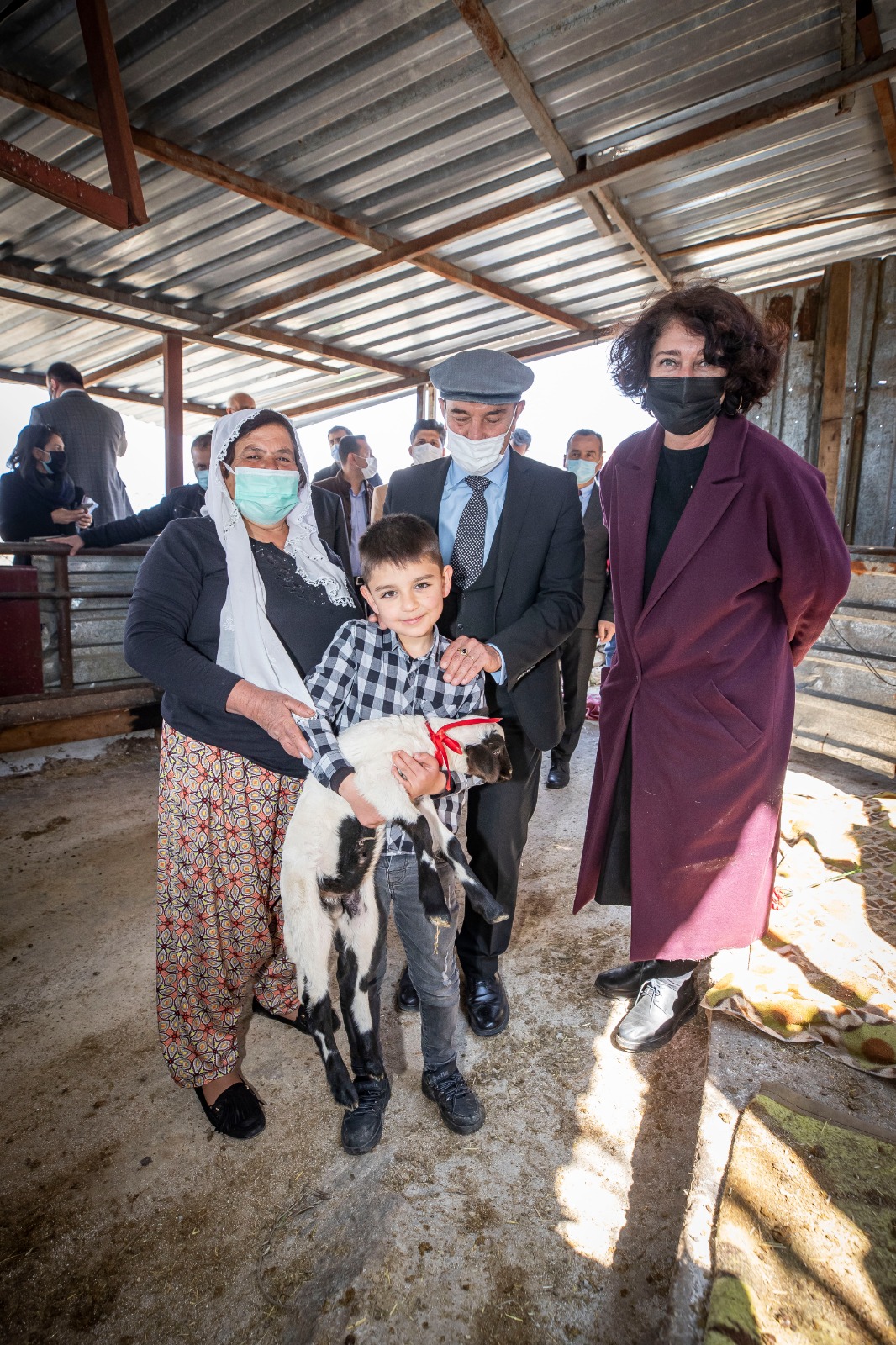 Başkan Soyer, Karakızlar köyü sakinlerini de ziyaret etti. Burada Büyükşehir tarafından 4 koyun verilen Fatma Sezer ve ailesiyle bir araya gelen Soyer, tarım ve hayvancılığın önemine değindi. Fatma Sezer de şunları söyledi: “Bize 4 koyun verdi. Biz onları büyütüp çoğalttık. Allah razı olsun. Seve seve bakıyoruz. Sadece yem pahalı olduğu için o konuda biraz zorlanıyoruz.” Soyer çifti kuzuları da sevdi.