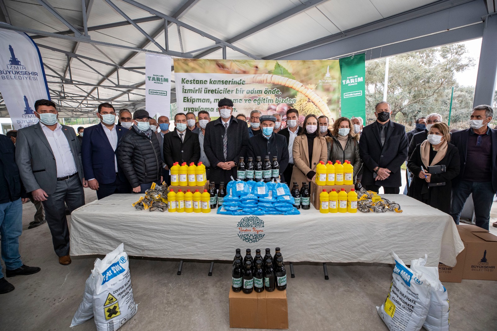 İzmir Büyükşehir Belediye Başkanı Tunç Soyer'in, Küçük Menderes Havzası turu bugün de tarihi ve doğal güzellikleriyle ön plana çıkan Tire ilçesiyle devam etti. Eşi Neptün Soyer, Tire Belediye Başkanı Salih Atakan Duran ve eşi Necibe Duran'ın yanı sıra İzmir Büyükşehir Belediyesi Genel Sekreteri Dr. Buğra Gökçe, İzmir Büyükşehir Belediyesi Genel Sekreter Yardımcıları Ertuğrul Tugay, Yıldız Devran, Eser Atak, Suphi Şahin, İZBETON Genel Müdürü Heval Savaş Kaya, İZSU Genel Müdürü Aysel Özkan ile bürokratların ve muhtarların katıldığı program Boynuyoğun Hali’ne düzenlenen ziyaretle başladı. Muhtarların karşıladığı Soyer, İzmir Büyükşehir Belediyesi tarafından bünyesinde soğuk hava deposu, kantar ve ürün boylama ünitesinin yer aldığı ürün alım merkezini inceledi. Yine Büyükşehir'in kestane kanseriyle mücadeleye yönelik havzada yürüttüğü çalışmalar hakkında bilgi alan Başkan Soyer, tesiste düzenlenen malzeme dağıtım törenine katıldı. Ödemiş, Kiraz, Beydağ ve Tire ilçelerinden toplam 2 bin 112 kestane üreticisine göztaşı, ardıç katranı, koruyucu gözlük ve dezenfeksiyon malzemesinden oluşan mücadele seti dağıtıldı.