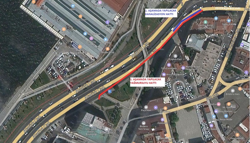 Proje kapsamında terfi merkezini denize bağlayan hatların imalatları, Atatürk Caddesi'nin aşamalar halinde kapatılmasıyla yapıldı ve terfi merkezinin denize bağlantısı tamamlandı. Atatürk Caddesi'ndeki trafik düzeni eski haline getirildi. Terfi merkezine bağlanacak kuşaklama yağmur suyu hattının Fevzipaşa Bulvarı'na kadar yapılacak 1. aşama imalatları için yolun sağ şeridi geçici olarak kısımlar halinde kapatılarak çalışma alanı oluşturulacak ve kazı çalışmalarına başlanacak. Yarın başlayacak çalışmaların Mayıs ortasına kadar tamamlanması ve Fevzipaşa Bulvarı'nda yapılacak 2. aşama imalatlara geçilmesi hedefleniyor.