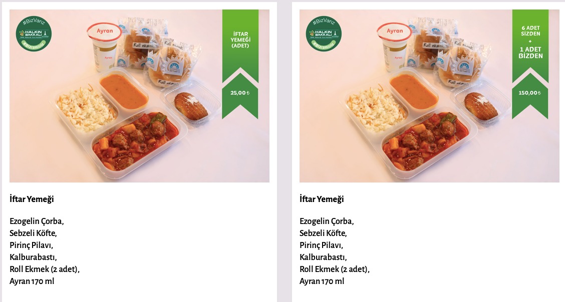 Yurttaşlar burada farklı fiyat seçenekleriyle sunulan üç farklı iftar yemeği paketi ile gıda kolisinin detaylarını görebiliyor. 25 liralık “İftar Yemeği”, 150 liralık “6 Adet Sizden Bir Adet Bizden” paketi, 600 liralık “Aylık İftar Yemeği” paketi ile 100 liralık “Gıda Kolisi” seçeneklerinin altında ödeme yöntemleri de sunuluyor. Paketlerin altında ödeme seçenekleri de bulunuyor. Ödeme yöntemini belirleyen yurttaşlar, işlemleri tamamladıktan sonra iftar yemeği paketlerinden ve gıda kolisinden istediği sayıda satın alabiliyor.