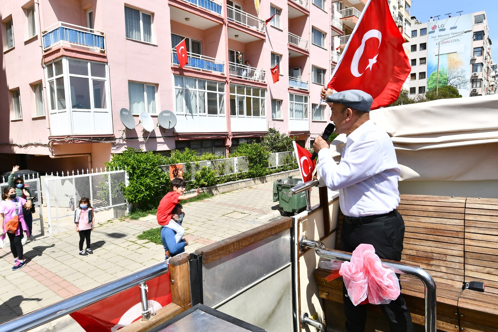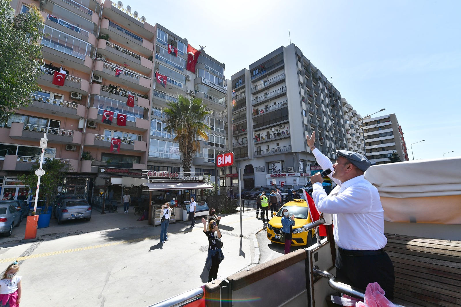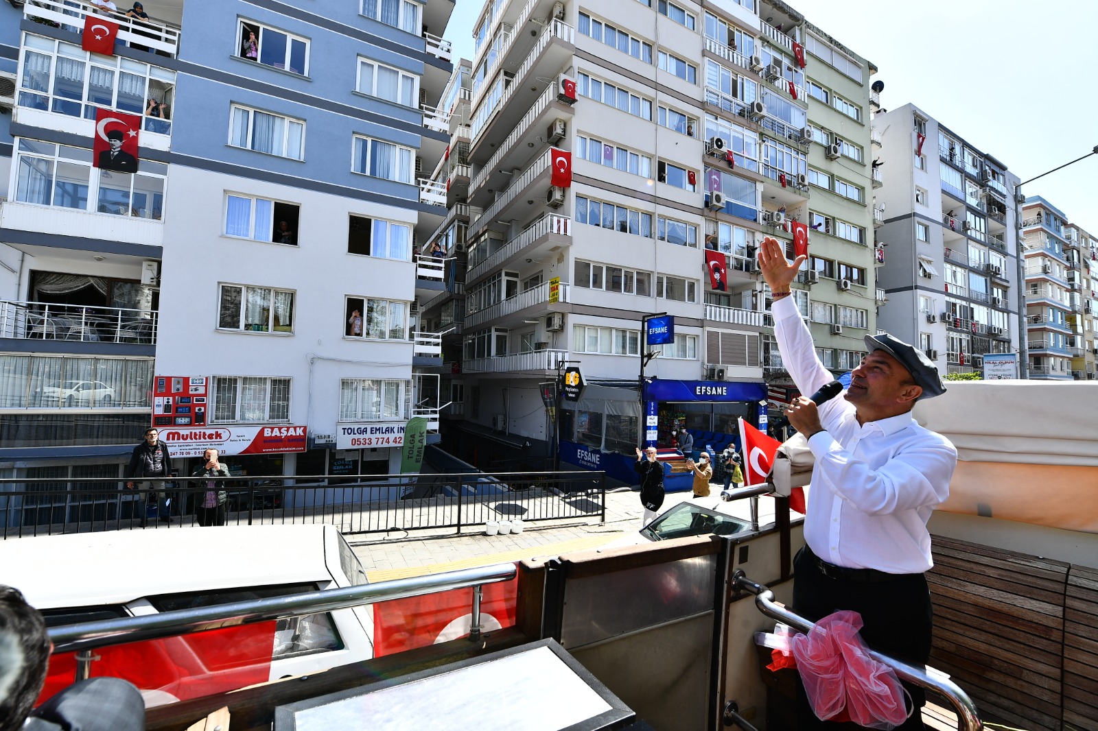İzmir Büyükşehir Belediye Başkanı Tunç Soyer, 23 Nisan Ulusal Egemenlik ve Çocuk Bayramı’nın 101. yılında kentin sokaklarını otobüsle dolaşarak İzmirlilerin bayramını kutladı. Balkonlarına çıkan İzmirlilere seslenen Soyer, “Meydanlara gelemiyorsunuz ama biz bayram coşkusunu size getirdik” dedi. Bandonun yer aldığı iki otobüs Başkan Soyer’e eşlik ederken, 46 müzisyenin bulunduğu diğer beş otobüs ise İzmir’in diğer ilçelerinde tura çıktı.