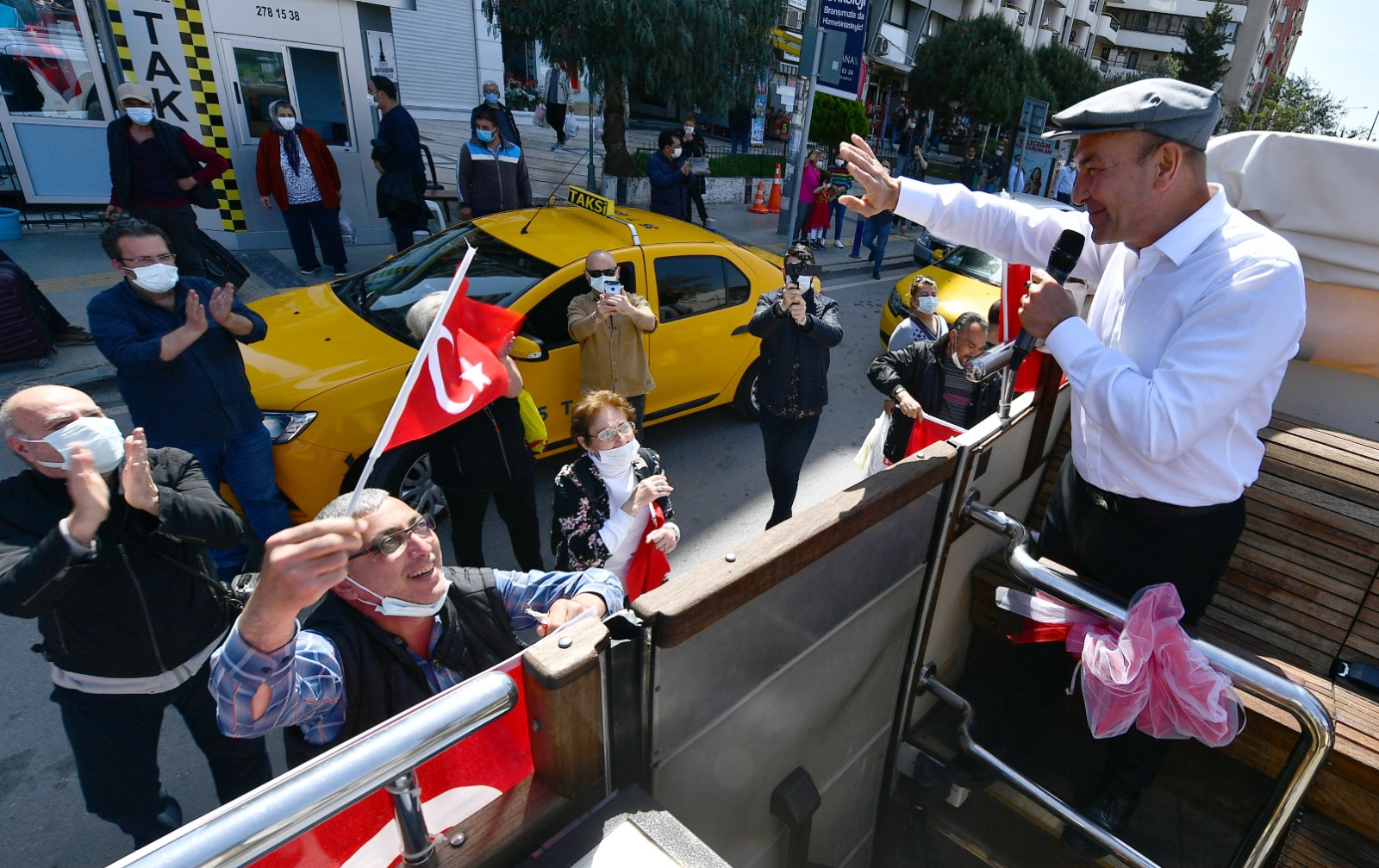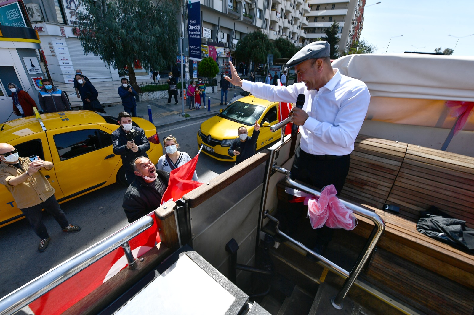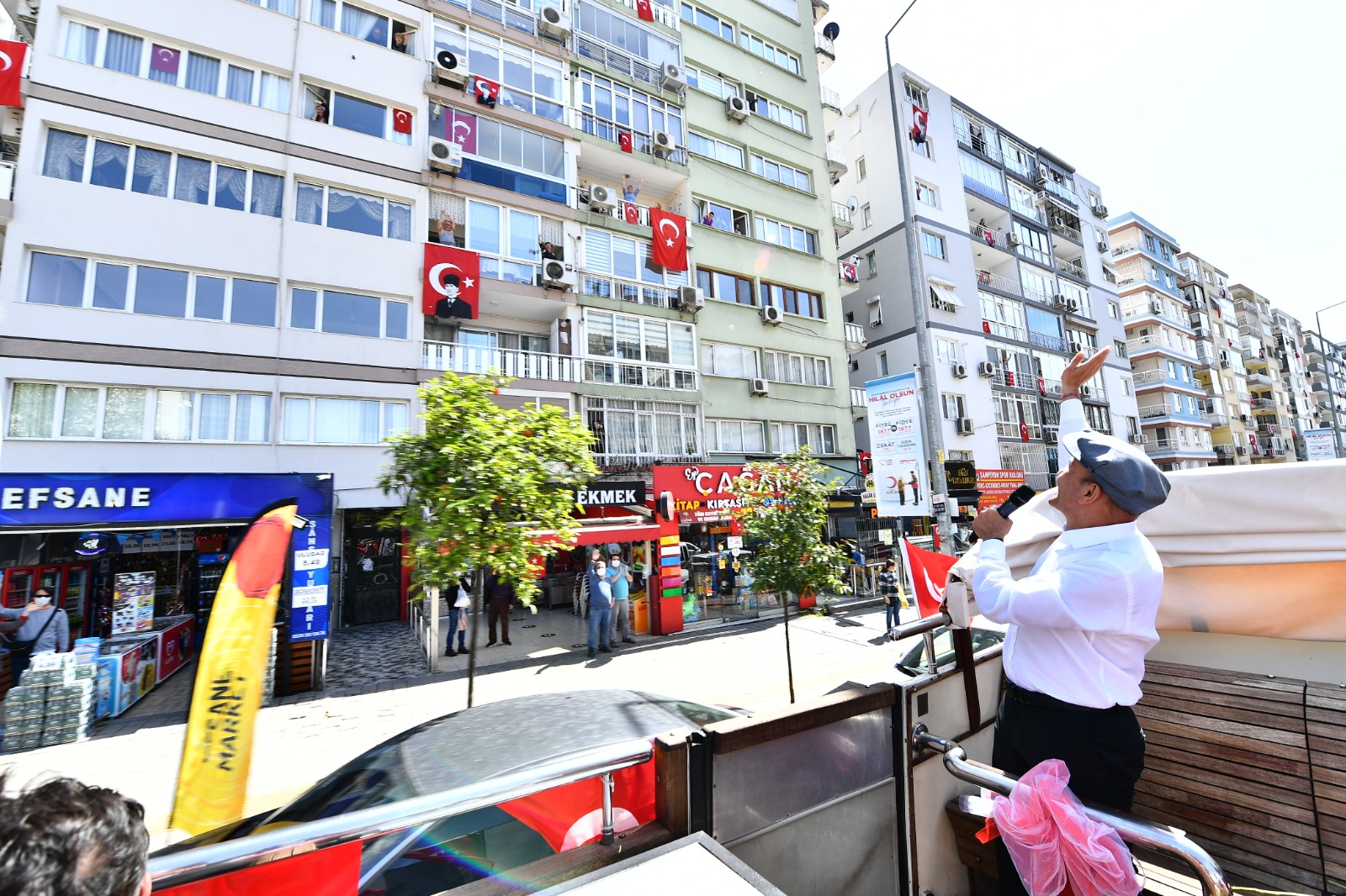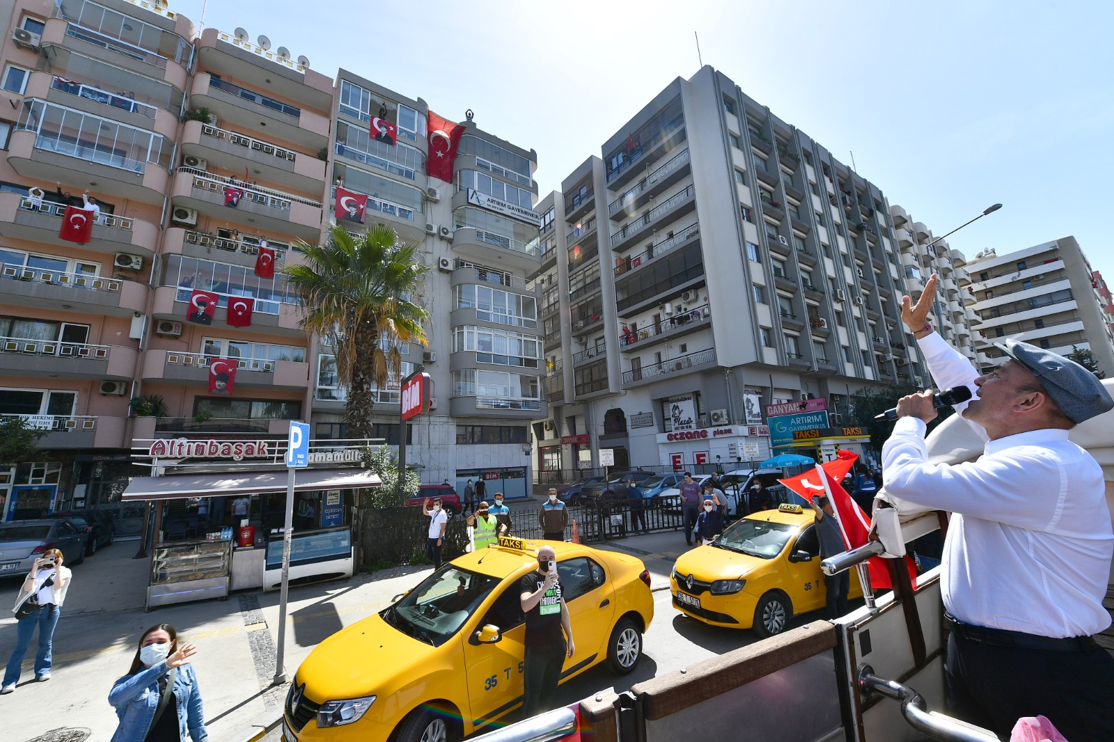 İzmir Büyükşehir Belediye Başkanı Tunç Soyer, 23 Nisan Ulusal Egemenlik ve Çocuk Bayramı’nın 101. yılında kentin sokaklarını otobüsle dolaşarak İzmirlilerin bayramını kutladı. Balkonlarına çıkan İzmirlilere seslenen Soyer, “Meydanlara gelemiyorsunuz ama biz bayram coşkusunu size getirdik” dedi. Bandonun yer aldığı iki otobüs Başkan Soyer’e eşlik ederken, 46 müzisyenin bulunduğu diğer beş otobüs ise İzmir’in diğer ilçelerinde tura çıktı.