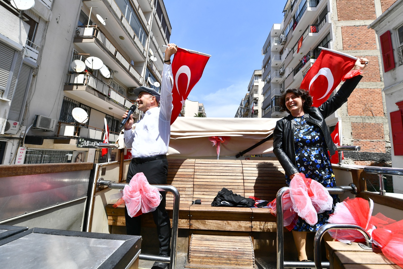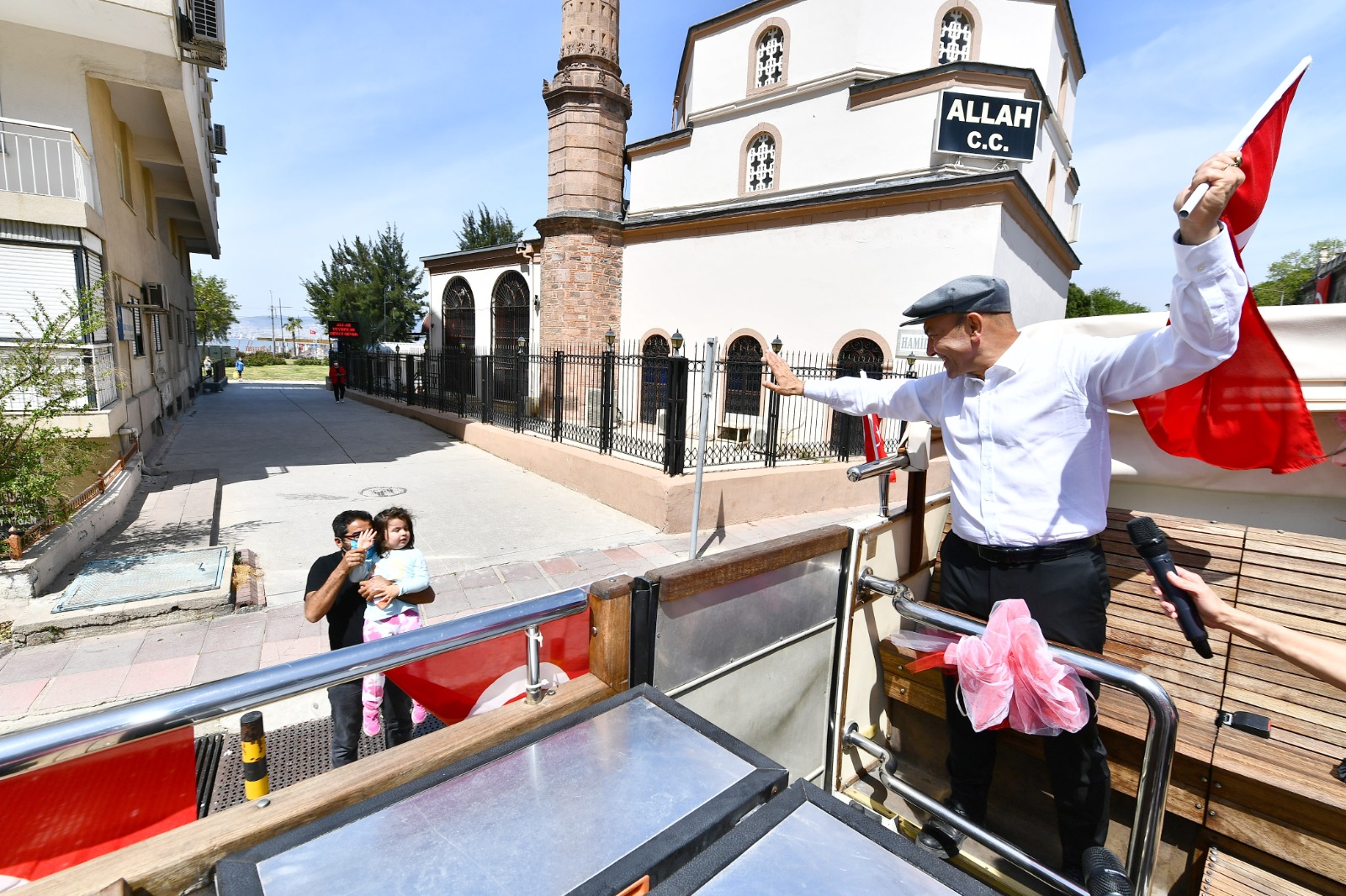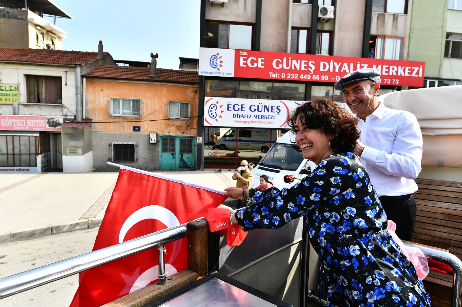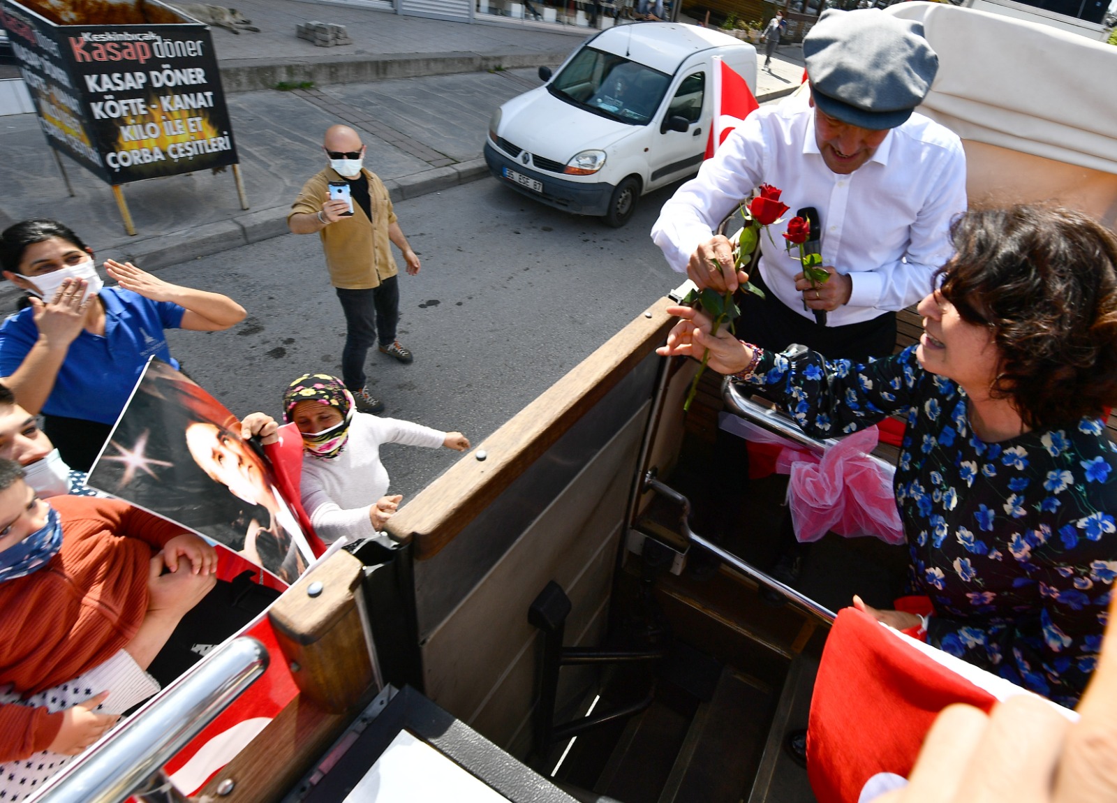 İzmir Büyükşehir Belediye Başkanı Tunç Soyer ve eşi Neptün Soyer 23 Nisan Ulusal Egemenlik ve Çocuk Bayramı’nda otobüsle şehrin sokaklarını dolaştı. Parklarda oynayan çocuklar, alışveriş yapmak için çıkan yurttaşlar ve balkonlarından kendilerini, Türk bayraklarının yanı sıra alkışlar eşliğinde coşkuyla karşılayan İzmirlilerin bayramını kutlayan Başkan Tunç Soyer, geçtiği güzergahta çalışanlara ve esnafa da seslenerek hayırlı işler diledi.