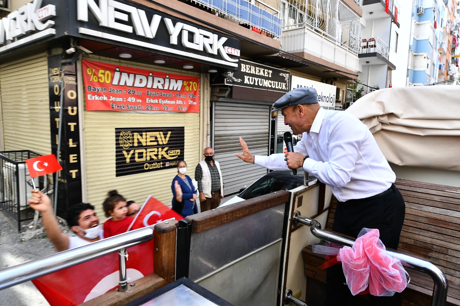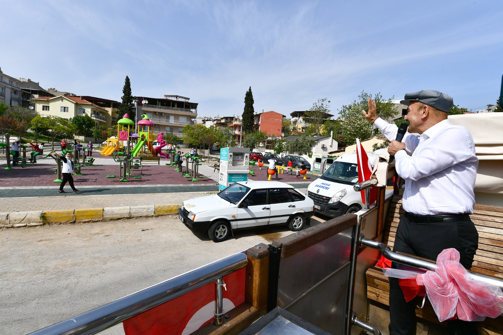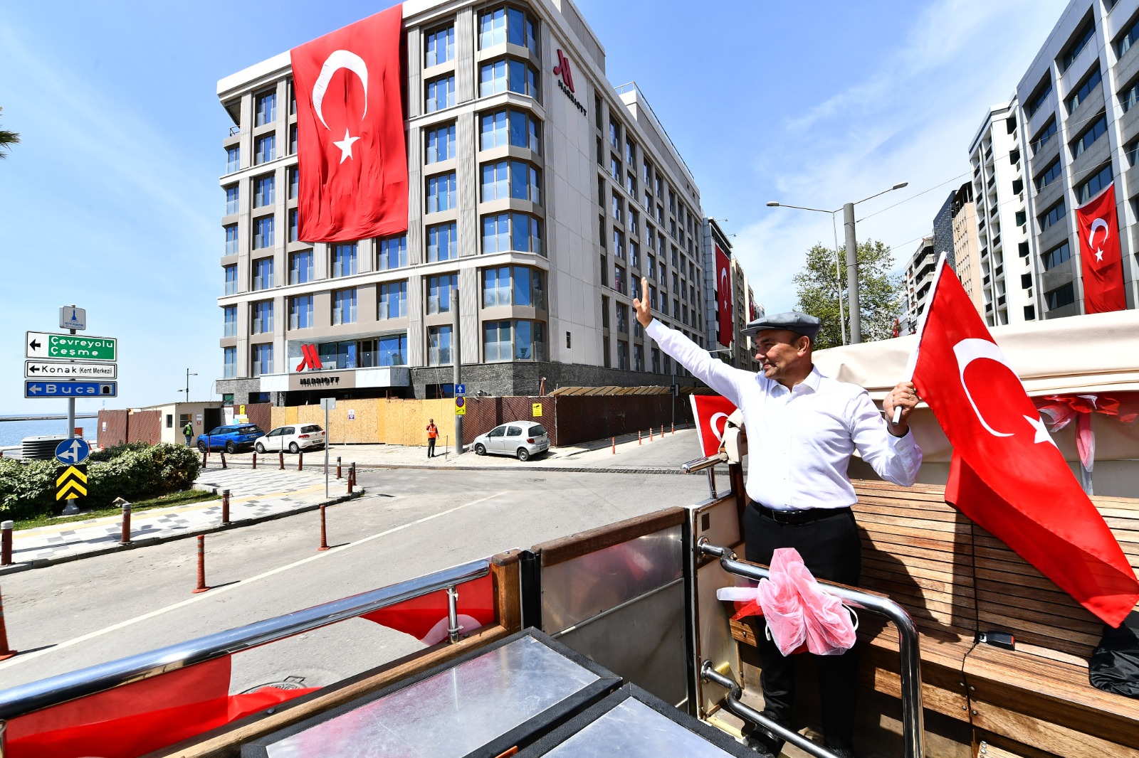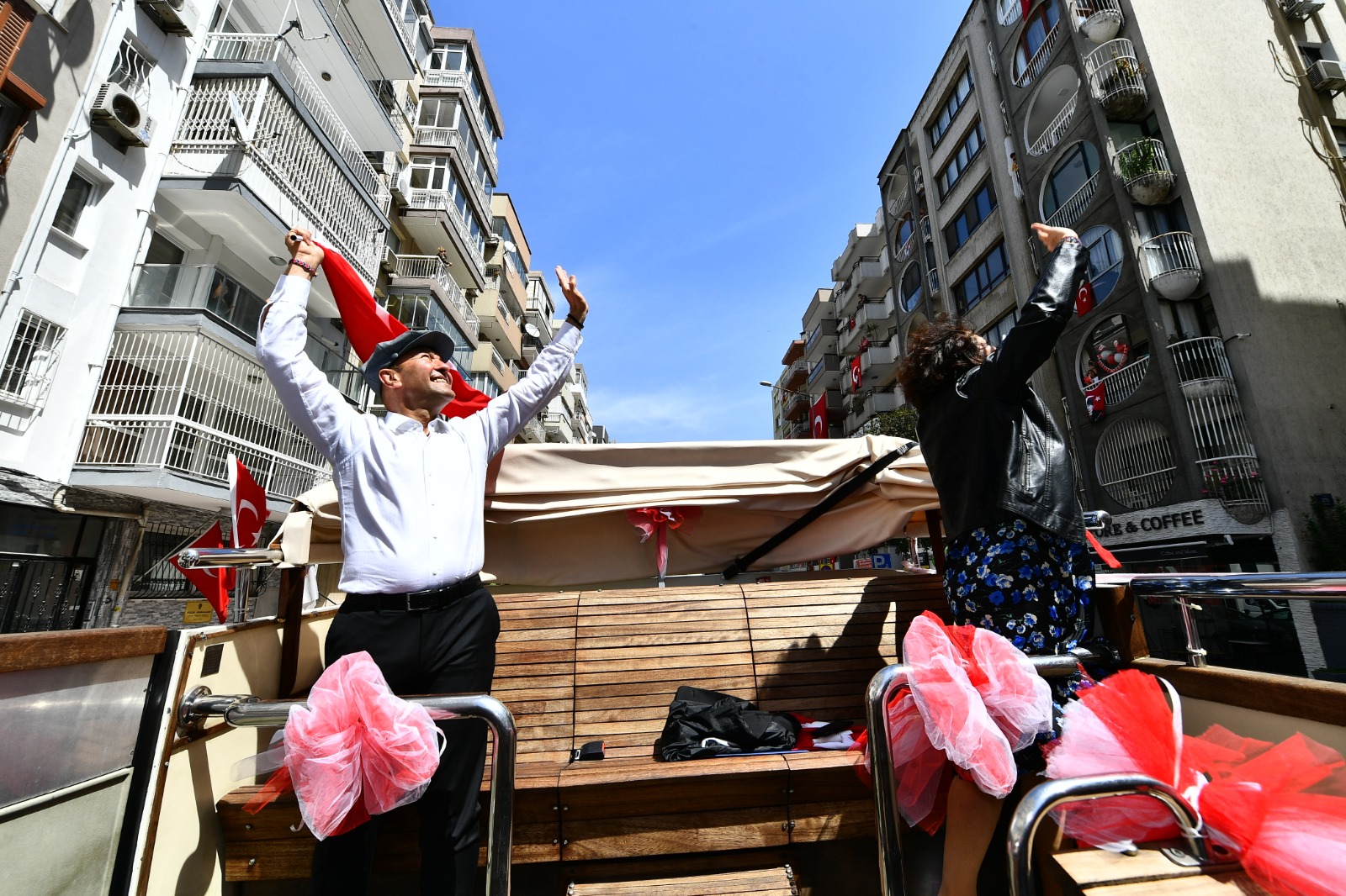 İzmir Büyükşehir Belediye Başkanı Tunç Soyer ve eşi Neptün Soyer 23 Nisan Ulusal Egemenlik ve Çocuk Bayramı’nda otobüsle şehrin sokaklarını dolaştı. Parklarda oynayan çocuklar, alışveriş yapmak için çıkan yurttaşlar ve balkonlarından kendilerini, Türk bayraklarının yanı sıra alkışlar eşliğinde coşkuyla karşılayan İzmirlilerin bayramını kutlayan Başkan Tunç Soyer, geçtiği güzergahta çalışanlara ve esnafa da seslenerek hayırlı işler diledi.