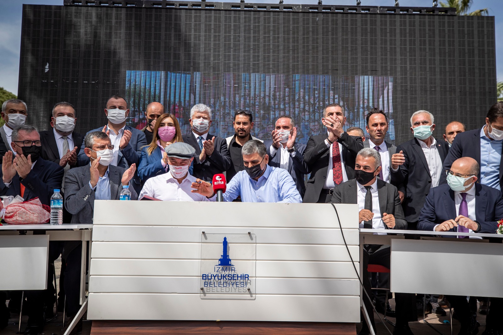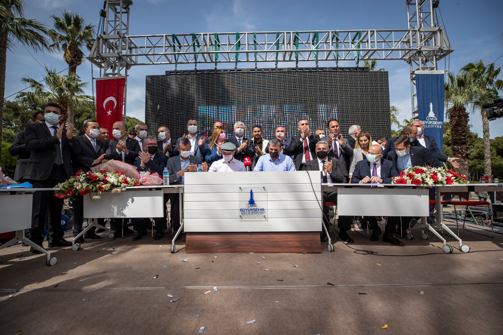 - İzmir Büyükşehir Belediye Başkanı Tunç Soyer, bayram havasında geçen imza töreninde “Hangi belediye şirketinde çalışırsa çalışsın, işçiler bu dönemin sonunda aynı düzeyde maaş alacak. Eşit işe farklı maaş adaletsizliği çok yakında tarihe karışacak” dedi.