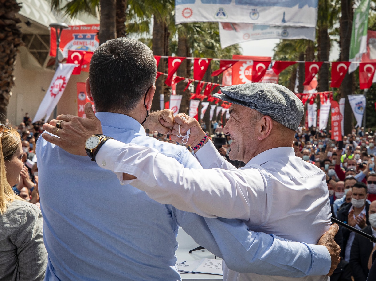 İzmir Büyükşehir Belediyesi şirketi İZELMAN ile DİSK Genel-İş Sendikası arasında uzlaşma ile sonuçlanan toplu iş sözleşmesinin imza töreni, erken 1 Mayıs kutlamasına sahne oldu. 7 bin personeli ilgilendiren ve tüm taban ücretlere yüzde 21 oranında zam öngören sözleşmenin imza töreninde işçiler, Büyükşehir Belediye Başkanı Tunç Soyer’e sevgi gösterilerinde bulundu. Kültürpark'taki imza törenine İzmir Büyükşehir Belediye Başkanı Tunç Soyer, CHP Grup Başkan Vekili Özgür Özel, CHP İzmir Milletvekili Murat Bakan, CHP İzmir Milletvekili Sevda Erdan Kılıç, CHP İzmir Milletvekili Ednan Arslan, CHP PM Üyesi Rıfat Nalbantoğlu ile Devrim Barış Çelik, DİSK Genel-İş Genel Başkanı Remzi Çalışkan, İzmir Büyükşehir Belediye Başkan Vekili Mustafa Özuslu, İzmir Büyükşehir Belediyesi Genel Sekreteri Dr. Buğra Gökçe, Konak Belediye Başkanı Abdül Batur, Dikili Belediye Başkanı Adil Kırgöz, CHP İzmir İl Başkanı Deniz Yücel, CHP Konak İlçe Başkanı Çağrı Gruşçu, sendika başkanları ile temsilcileri katıldı.