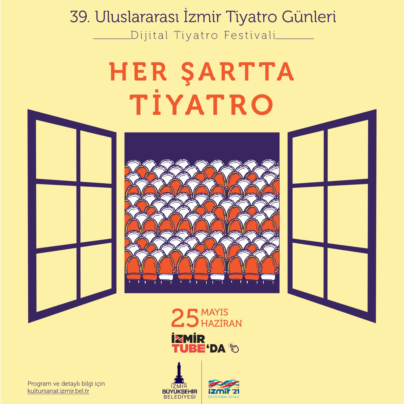 İzmir Büyükşehir Belediyesi tarafından bu yıl 39’uncusu düzenlenen İzmir Tiyatro Günleri 25 Mayıs–25 Haziran tarihlerinde internet üzerinden evlere konuk olacak. Pandemi koşulları sebebiyle ertelenen tiyatro günleri kapsamındaki oyunların tamamı İzmirTube üzerinden yayınlanacak. İzmir Büyükşehir Belediye Başkanı Tunç Soyer, “Pandemi koşullarından dolayı salonlarda perde açamıyorsak evlerde perde açarız. Her şartta tiyatro, diyoruz” diye konuştu.