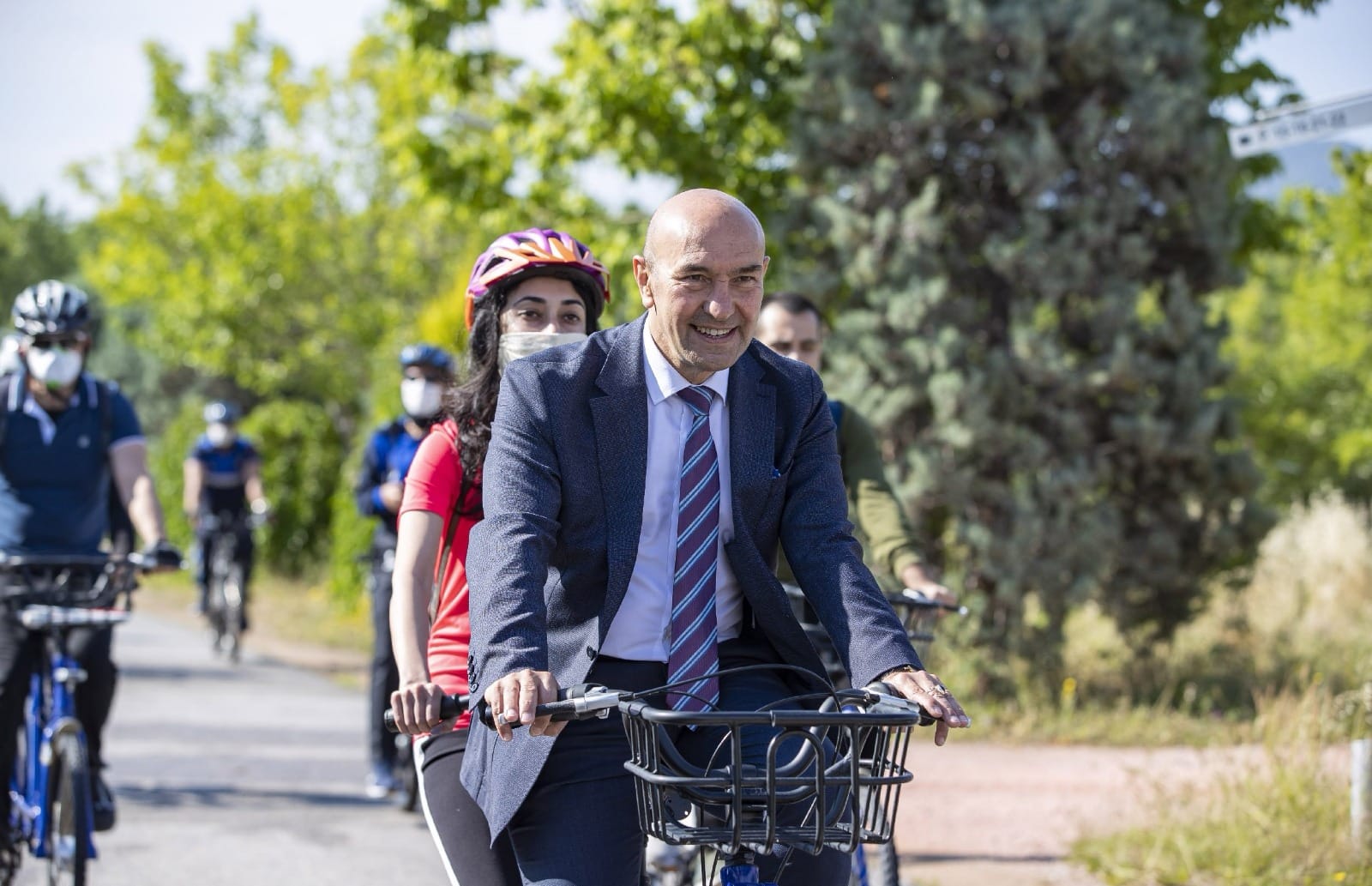 Otomobil odaklı çözümlerin, özellikle kent merkezlerinde yoğun trafik yükü ortaya çıkardığını ve pandemi ile birlikte trafikteki araç yükünün arttığını söyleyen İzmir Büyükşehir Belediye Başkanı Tunç Soyer, “Sürdürülebilir ve dirençli bir kent olma hedefi doğrultusunda her alanda olduğu gibi ulaşımda da bütünsel ve kapsamlı bir politika yürütüyoruz. Pandemi döneminde bisikletin değeri tüm dünyada daha iyi anlaşıldı. Ulaşım politikalarında bizim bisikletli ulaşıma ayırdığımız alanın ne kadar önemli olduğu anlaşıldı. Temel amacımız enerji verimliliği yüksek, kaynakları daha az tüketen, güvenilir, sağlıklı, doğaya saygılı ve erişilebilir ulaşımı teşvik etmek. İnsanlarımız iki teker üzerinde daha çok zaman geçirsinler, bisikletli ulaşımı daha çok tercih etsinler istiyoruz. Kent içindeki birçok arterde yeni bisiklet yolları yapımına başladık. Güvenli bisiklet yollarıyla vatandaşlarımızı ulaşmak istedikleri her yere taşımak istiyoruz. Şehir merkezinde uygulanan bisiklet park yerleri ile bisiklet tamir istasyonlarını merkez dışı ilçelerde de yaygınlaştırıyoruz” dedi.