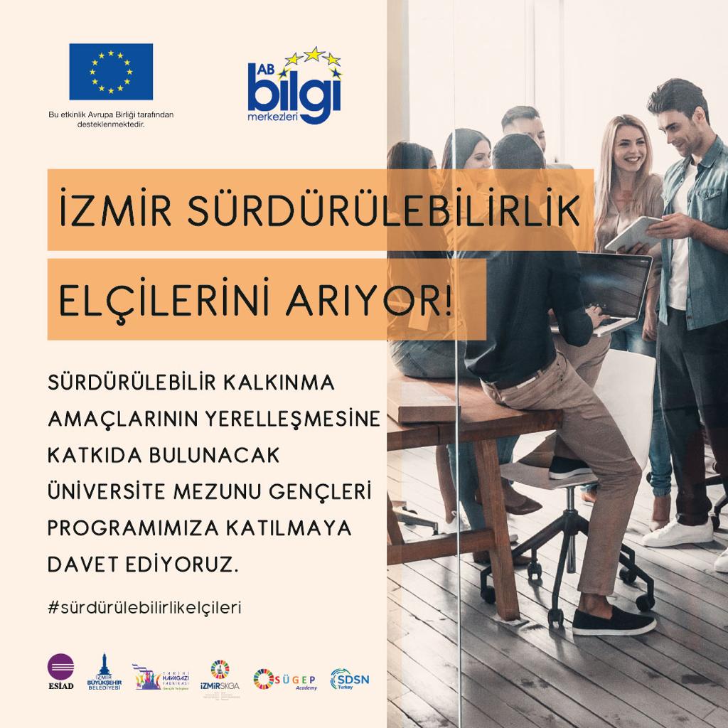 Avrupa Birliği Türkiye Delegasyonu, ESİAD İzmir AB Bilgi Merkezi ve İzmir Sürdürülebilir Kentsel Gelişim Ağı tarafından İzmir Büyükşehir Belediyesi, Sürdürülebilir Kalkınma Gençlik Liderleri Eğitim Programı (SÜGEP) ve Boğaziçi Üniversitesi SDSN Türkiye iş birliğinde düzenlenen Sürdürülebilirlik Elçileri Eğitim Programlarının ilki 5 Haziran'da başlıyor. Toplam 12 haftalık program boyunca “Sürdürülebilirlik Yetkinlikleri” konusunda özel tasarlanmış eğitimleri alacak gençler, Avrupa Yeşil Mutabakatı kapsamında 6 haftalık eğitim sonunda kamu ve özel sektörde sürdürülebilirlik ofisleri bulunan iş yerlerinde 6 haftalık staja gönderilecek.