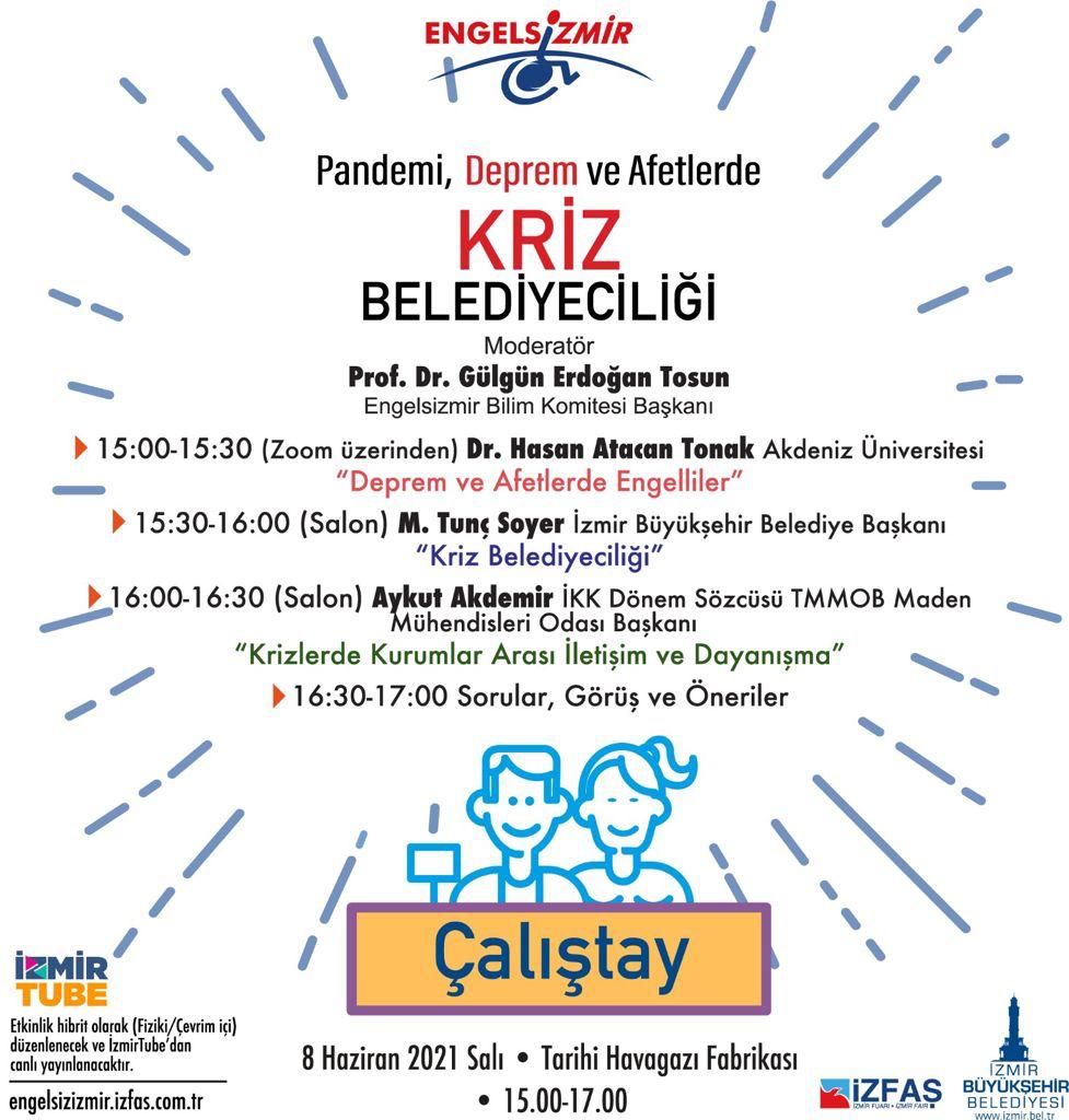 İzmir Büyükşehir Belediyesi, Uluslararası Engelsİzmir 4. Kongresi kapsamında "Pandemi, Afet ve Depremlerde Kriz Belediyeciliği" başlıklı bir çalıştay düzenledi. Tarihi Havagazı Fabrikası'nda düzenlenen çalıştayda engelli bireylerin ve ailelerinin olası bir deprem, afet gibi durumlarda yaşadığı sorunlar ve çözüm önerileri gündeme geldi. Çalıştayın sonunda özellikle doğal felaketlerde hayat kurtarmak için İzmir Büyükşehir Belediyesi'nin çalışmalarını başlattığı engelli veri tabanı çalışmaları için merkezi hükümetten destek istendi.
