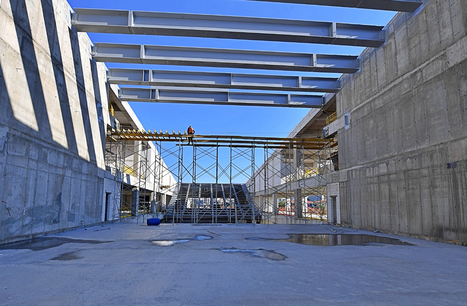 İzmir Büyükşehir Belediyesi Yapı İşleri Dairesi Başkanı Murat Yenigül, “Zemin iyileştirme çalışmalarını bitirdik. Toplam 9 bloğumuz var. 4 blokta betonarme ve çelik konstrüksiyon çalışmalarını tamamladık. 5 blokta hafriyat devam ediyor. Yakında sahnenin bulunduğu blokta temel çalışmalarına başlayacağız. Yıl içerisinde 9 bloğun kaba inşaatını tamamlayıp dış cephe ve zemin kaplama imalatlarıyla birlikte ince işlere başlamayı planlıyoruz” dedi.