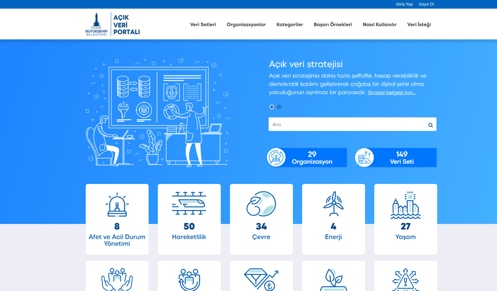 İzmir Büyükşehir Belediye Başkanı Tunç Soyer, İzmirlilerin kentle ilgili tüm bilgilere ulaşabildiğini söylerken, portalın akademisyenlerin araştırmalarına, kamu ve özel kuruluşların yöneticilerinin karar alma süreçlerine de katkı sağladığını belirtti. Başkan Soyer, “Yeni iş kurmak veya işini geliştirmek isteyen girişimcilerin de ihtiyaç duyduğu verilere ulaşmasını sağlayan açık veri portalında bir yıl boyunca aralarında belediyemizin daire başkanlıkları, ESHOT, İZSU, İZMİR METRO ve İZBAN’ın da bulunduğu 29 organizasyondan 149 veri seti yayına alındı. Hareketlilik, çevre, yaşam, sosyal belediyecilik, ekonomi gibi 10 farklı kategoride yayına devam eden portalda tüm hizmetlerimizle ilgili pek çok veri yayımlanıyor” dedi.