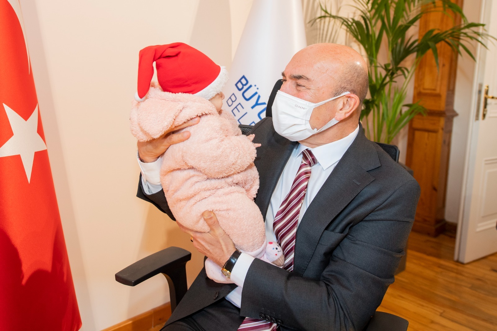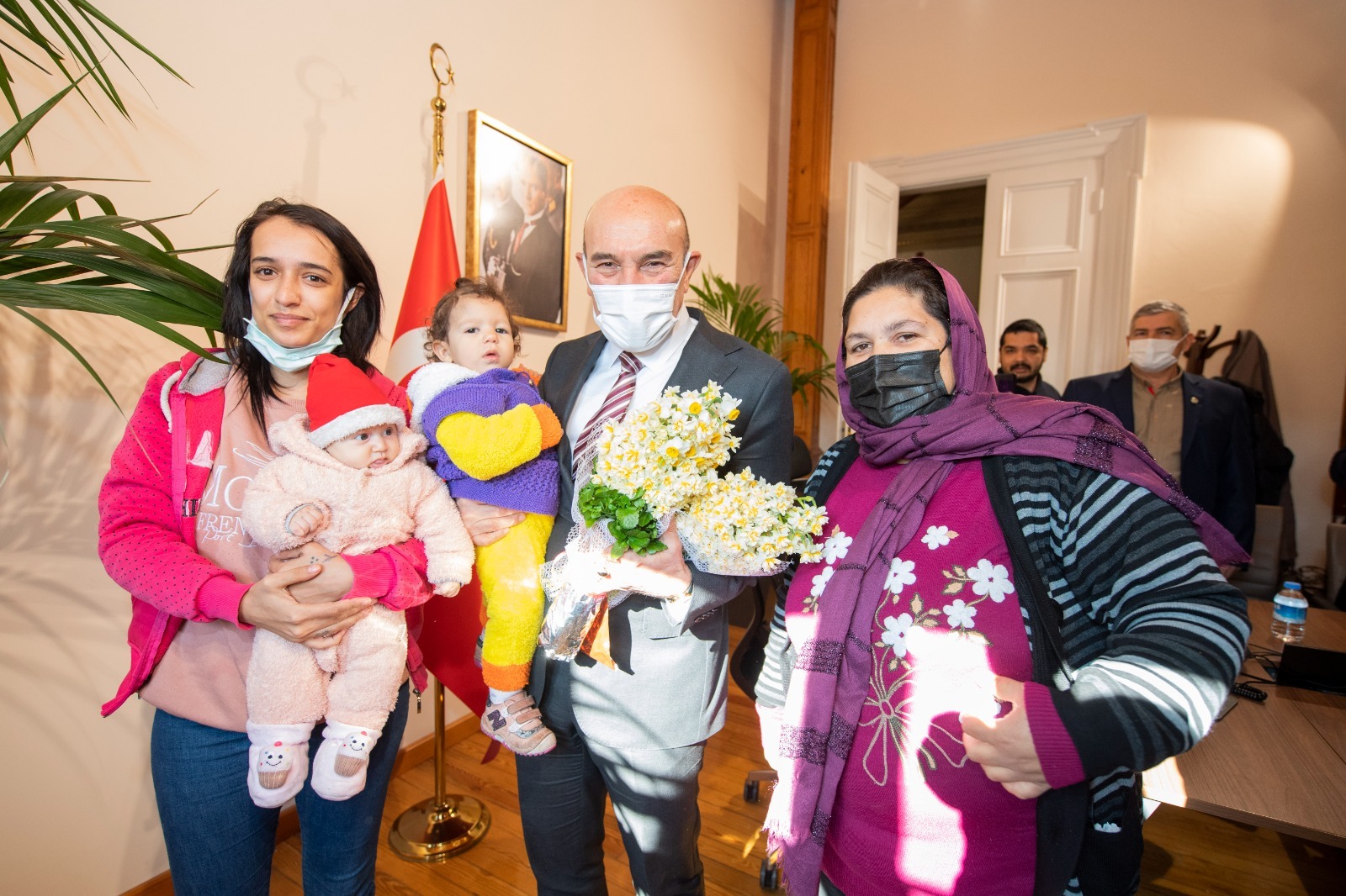 Başkan Soyer, aileleriyle birlikte kendisini ziyarete gelen 3 aylık Ayfer Nur Ördekoğlu ve 1,5 yaşındaki Elisa Demirdöven’le yakından ilgilendi.
