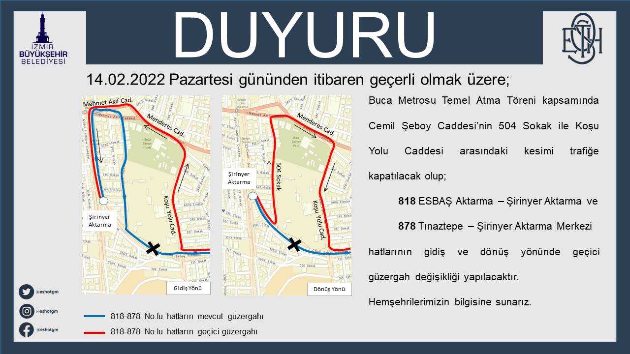 Yalnızca 14 Şubat Pazartesi günü geçerli olacak planlamalar kapsamında; 36 (Şirinyer Aktarma Merkezi – Gümrük), 236 (Şirinyer Aktarma Merkezi – Gümrük), 418 (Şirinyer Aktarma Merkezi – Halkapınar Metro), 466 (Şirinyer Aktarma Merkezi – Konak) ve 465 (Tınaztepe – Konak) numaralı hatların gidiş güzergâhları değiştirildi. 818 (ESBAŞ Aktarma – Şirinyer Aktarma Merkezi) ve 878 (Tınaztepe – Şirinyer Aktarma Merkezi) hatlarında ise hem gidiş hem de dönüş güzergâhları değiştirildi.