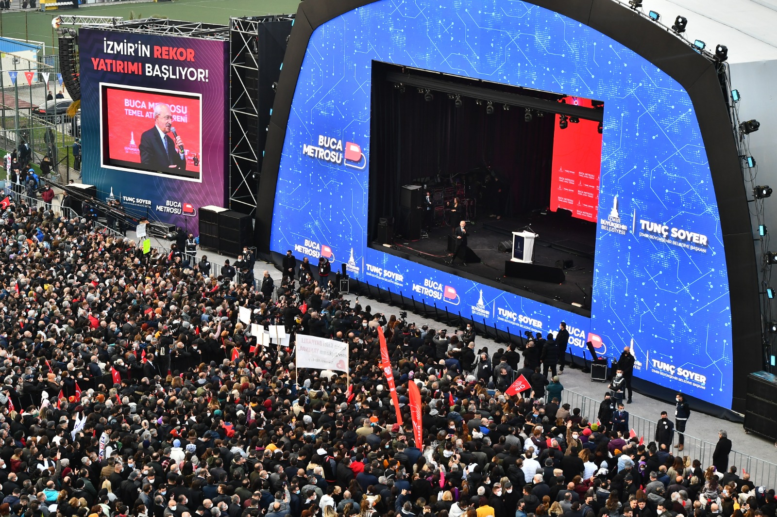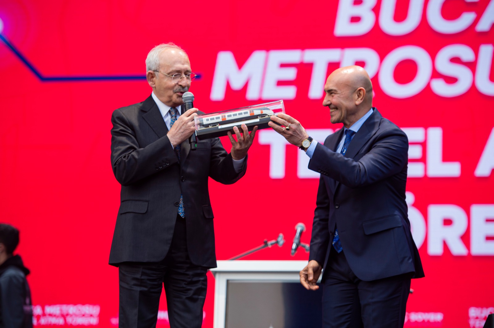 İzmir tarihinin en büyük yatırımı Buca Metrosu’nun temeli CHP Genel Başkanı Kemal Kılıçdaroğlu tarafından atıldı. “Halkın umudu Kılıçdaroğlu” sloganıyla karşılanan Kemal Kılıçdaroğlu “Baskılara rağmen belediye başkanlarımız ellerinden gelen bütün çabayı gösteriyorlar. Tunç Başkanımız da diğer belediye başkanlarımız da bütün baskıları aşarak görevlerini sürdürüyorlar. İzmir’in dağlarında çiçekler çok açtı ve açmaya devam edecek” dedi.