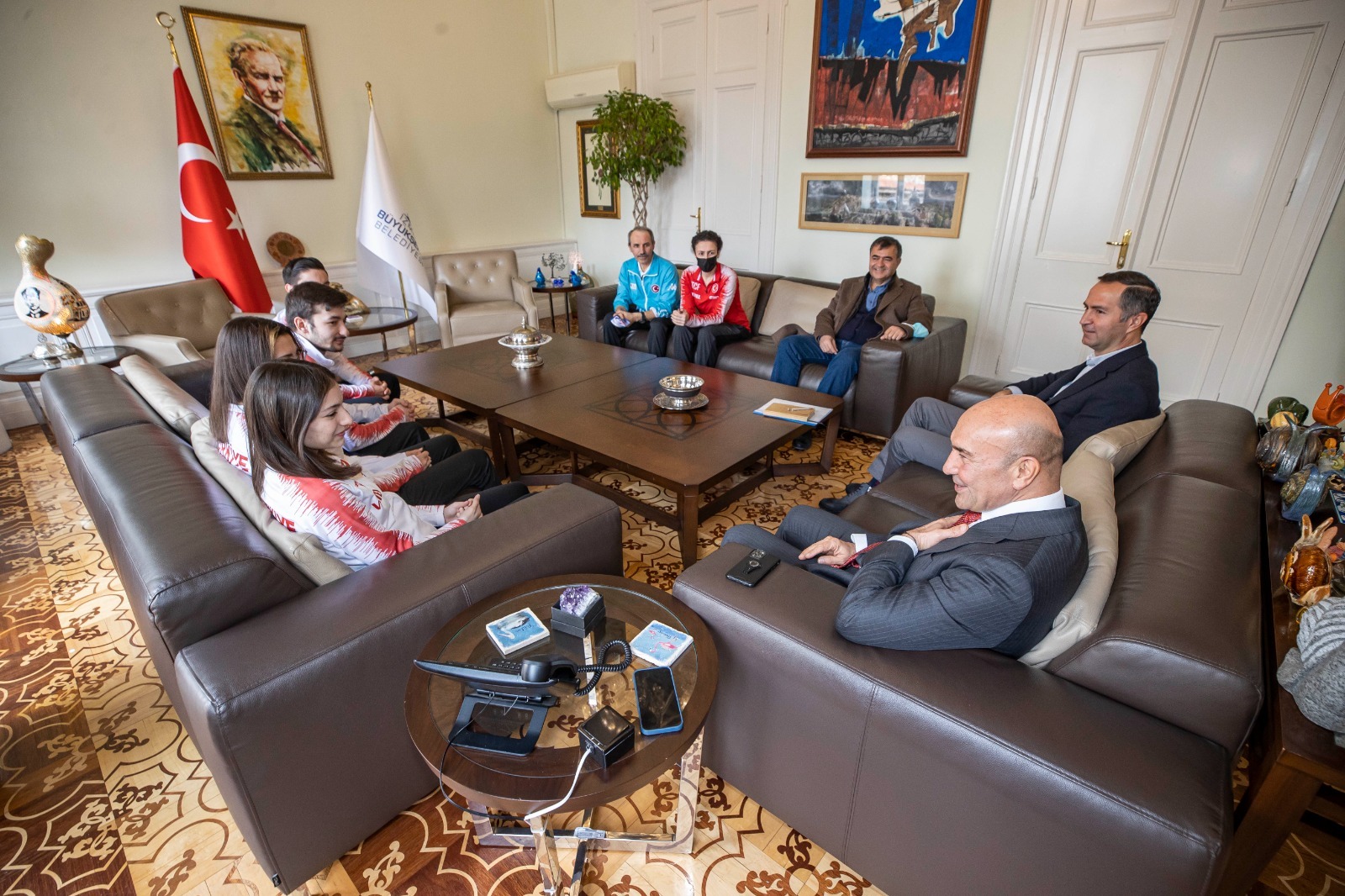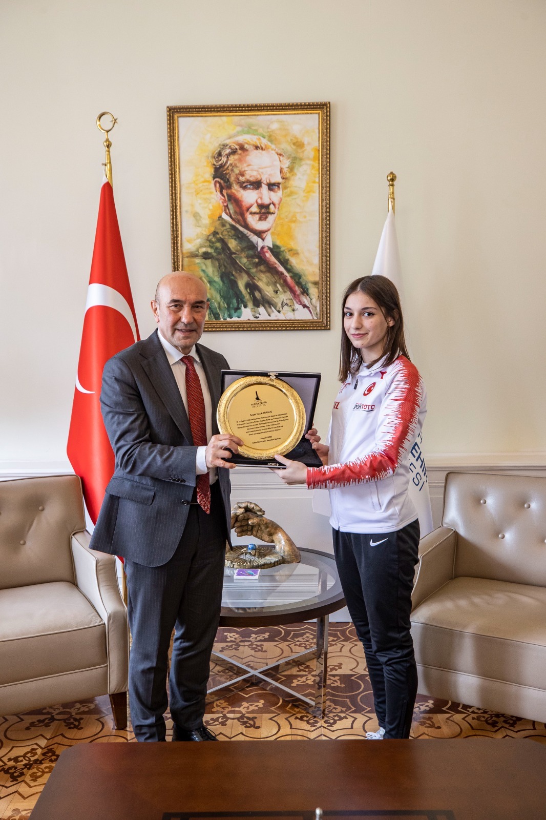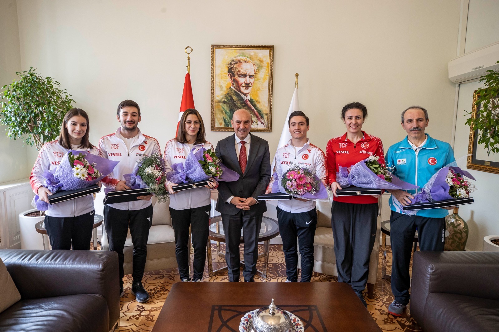 Bakü'de düzenlenen Trampolin Cimnastik Dünya Kupası'nda Türkiye adına ilk kez Dünya şampiyonluğu elden eden Sena Elçin Karakaş ve Sıla Karakuş ile yarışmada derece elde eden Hüseyin Engin Yontucu ve Gürkan Mutlu, İzmir Büyükşehir Belediye Başkanı Tunç Soyer’i makamında ziyaret etti. Ziyarette İzmir Büyükşehir Belediyesi Gençlik ve Spor Hizmetleri Dairesi Başkanı Hakan Orhunbilge ve sporcuların antrenörleri de yer aldı.