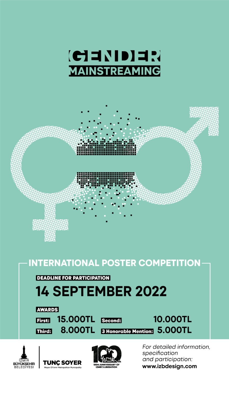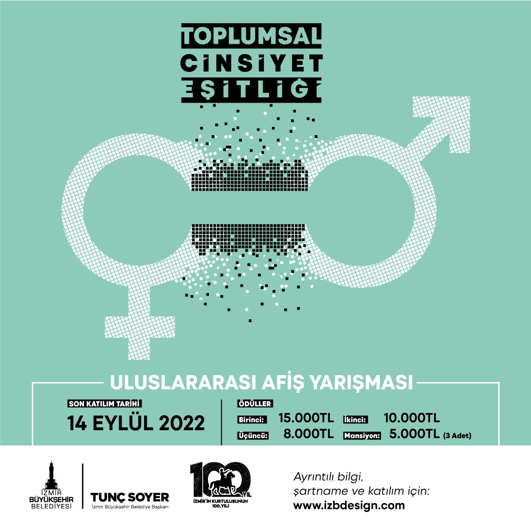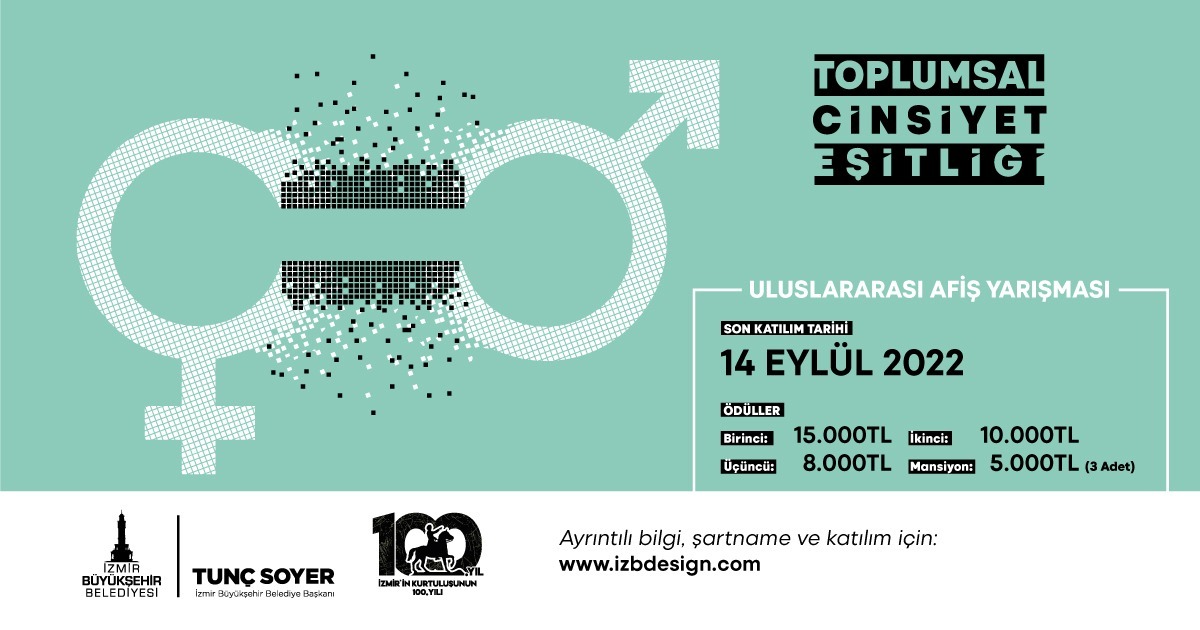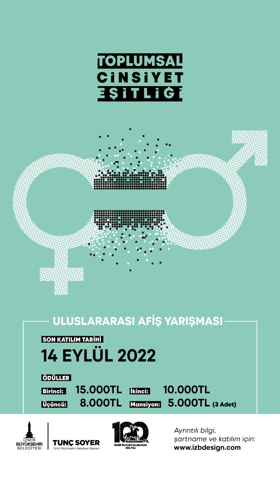 İzmir Büyükşehir Belediyesi 8 Mart Dünya Kadınlar Günü yaklaşırken “Hayatın Her Alanında Kadınlarla Eşit ve Adil Bir Dünya” sloganıyla kadın erkek eşitliğine dair farkındalık yaratmak üzere uluslararası afiş yarışması düzenliyor. “Toplumsal Cinsiyet Eşitliği” temasıyla düzenlenen yarışmaya 18 yaşını doldurmuş tüm amatör ve profesyonel tasarımcılar en fazla beş afiş ile katılabilecek. Tasarımcılar Mart ayı sonuna doğru afişlerini “www.izbdesing.com” adresine gönderebilir. 14 Eylül 2022 tarihine kadar başvuruların süreceği yarışmanın sonuçları ise 28 Eylül’de açıklanacak.