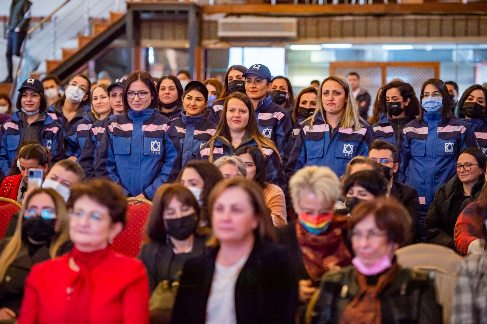Başkan Soyer, konuşmasının son bölümünde İZSU’da ağır vasıta kullanmak üzere iş hayatına başlayan 30 kadın emekçiyi alkışlayarak, “İzmir’de ağır vasıta ehliyetiyle, iş makinesi kullanma ehliyetiyle sertifikalarını verdiğimiz kadınlarımız var. Her biriyle ayrı ayrı iftihar ediyorum. Arkadaşlarım ‘bu işler erkek işidir’ denilen noktada hayata katılıyorlar. O kadar örnek bir şey yapıyorlar ki, sadece kendi ekmeklerini kazanmakla ilgili bir şey değil bu. Türkiye’deki bütün genç kadınlar için örnek oluyorlar. Biz, adı Anadolu olan bir memlekette, ismini bir kraliçeden almış bir kentte yaşıyoruz. İzmir, elbette toplumsal eşitliğin, kadın haklarının, cinsiyet eşitliğinin öncüsü olmaya devam edecek. Bu sorumluluk ve bilinçle hareket ediyoruz. Türkiye İzmir öncülüğünde yüz yıl beklemeden bambaşka bir noktaya gidecek” dedi.
