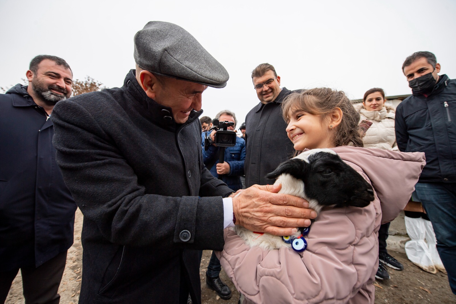 Başkan Soyer'e ziyareti sırasında kuzu da hediye edildi. Üreticinin yoğun emeği olduğunu belirten Soyer, kuzuyu yeniden üreticilere verdi.