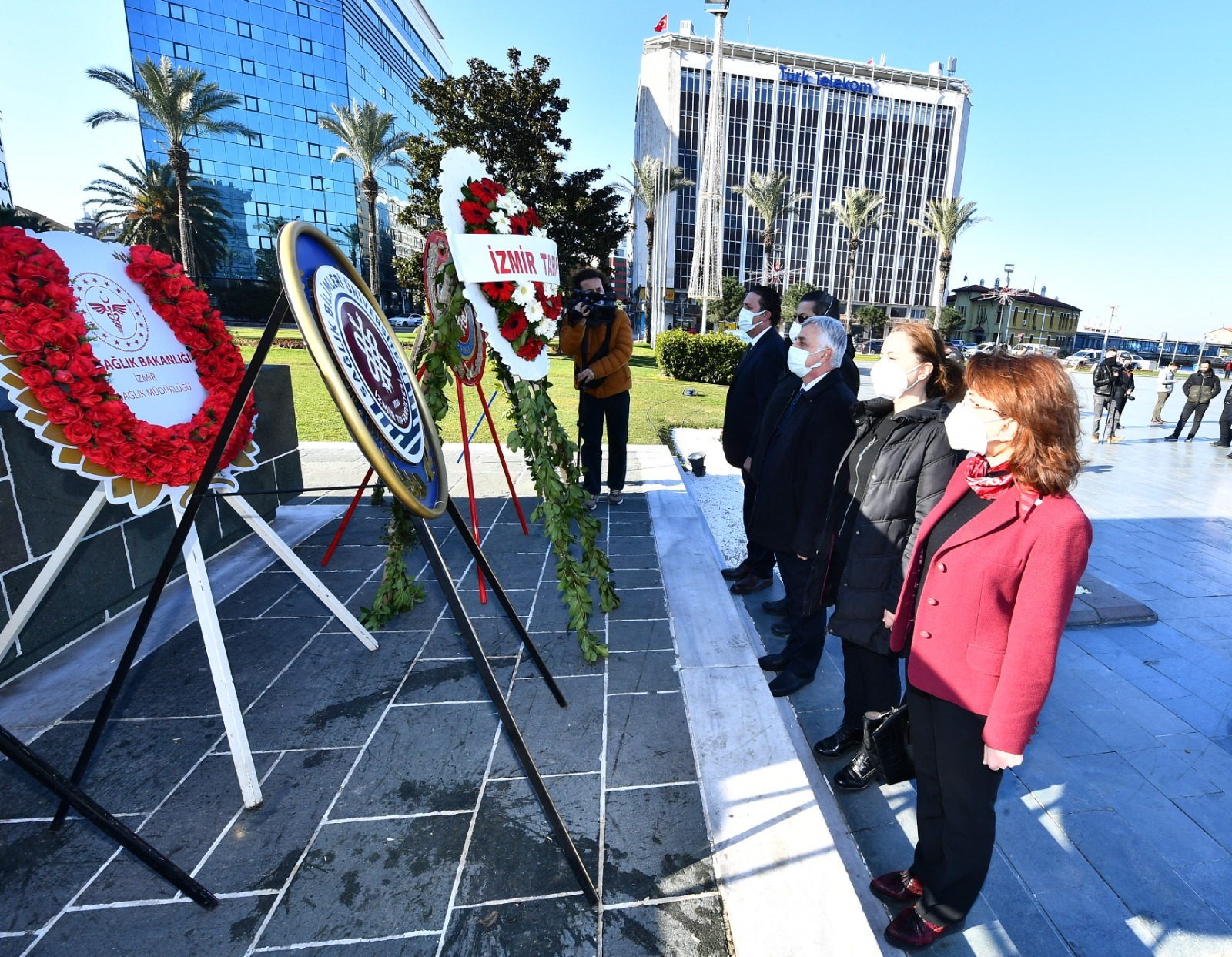 14 Mart Tıp Bayramı İzmir'de Cumhuriyet Meydanı'ndaki Atatürk anıtına çelenk koyma töreniyle başladı. Törene İzmir Büyükşehir Belediyesi Başkan Vekili Mustafa Özuslu katıldı. Törende konuşan İzmir İl Sağlık Müdür Vekili Hüseyin Bozdemir, sağlık çalışanlarının emeklerinin karşılık bulmasını, sağlık alanındaki tüm sorunların kısa sürede çözülmesini umut ettiğini söyledi.