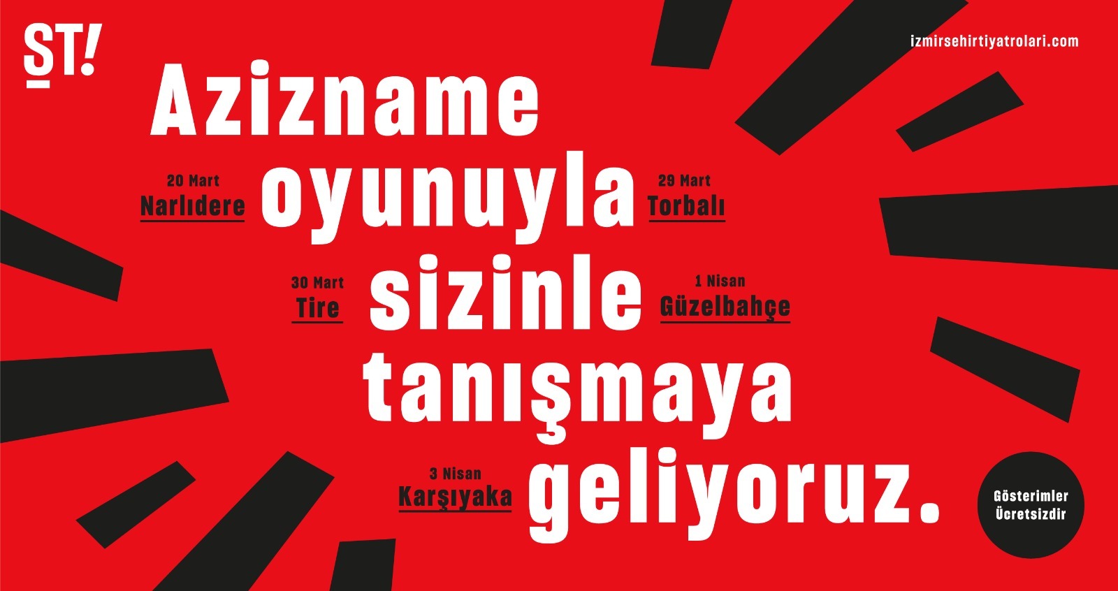 Genel Sanat Yönetmenliğini Yücel Erten’in yaptığı İzmir Büyükşehir Belediyesi Şehir Tiyatroları (İzBBŞT), Azizname oyunu ile beş ilçe belediyesinin kültür merkezlerinde seyirciyle buluşacak. 20 Mart’ta saat 20.00’de Narlıdere Atatürk Kültür Merkezi’nde başlayacak turne 29 Mart’ta aynı saatte Torbalı Belediyesi Kültür Merkezi Tiyatro Salonu’nda, 30 Mart’ta Tire Belediyesi Kültür Merkezi’nde, 1 Nisan’da Güzelbahçe Belediyesi Atatürk Kültür Merkezi’nde, 3 Nisan’da ise saat 21.00’de Karşıyaka Belediyesi Bostanlı Suat Taşer Tiyatrosu’nda devam edecek.