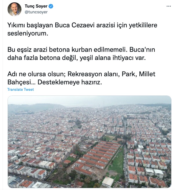 İzmir Büyükşehir Belediye Başkanı Tunç Soyer, Buca Cezaevi arazisini konut yapılaşmasına açacak bir plan değişikliğine kesinlikle karşı olduklarını söyledi. Sosyal medya hesabından çağrıda bulunan Soyer, “Yıkımı başlayan Buca Cezaevi arazisi için yetkililere sesleniyorum. Bu eşsiz arazi betona kurban edilmemeli. Buca'nın daha fazla betona değil, yeşil alana ihtiyacı var. Adı ne olursa olsun; rekreasyon alanı, park, Millet Bahçesi… Desteklemeye hazırız” dedi.