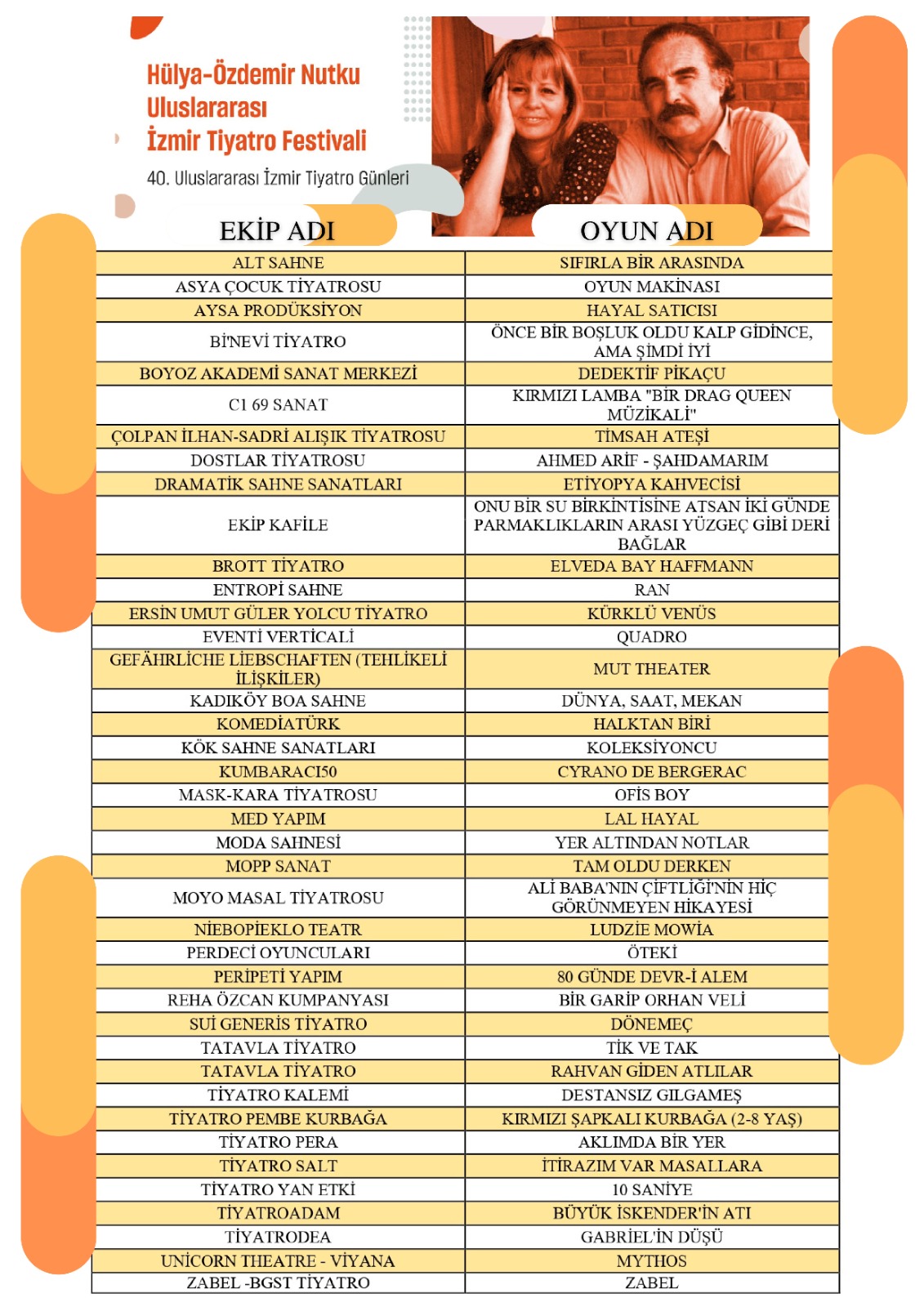 İzmir Büyükşehir Belediyesi’nin 2021’de hayatını kaybeden tiyatro araştırmacısı, İzmir Büyükşehir Belediyesi Şehir Tiyatroları (İzBBŞT) Danışma Kurulu Üyesi ve Sanat İletişim Direktörü Prof. Dr. Hülya Nutku ile 2019’da yaşamını yitiren tiyatrocu, şair ve yazar Prof. Dr. Özdemir Nutku’nun anısını yaşatmak üzere 2022’de “Hülya-Özdemir Nutku” adıyla düzenlediği Uluslararası İzmir Tiyatro Festivali (40. Uluslararası İzmir Tiyatro Günleri) başvuru sonuçları belli oldu. 300 tiyatro ekibi içinden 30 yetişkin oyunu, 4 uluslararası performans ve 6 çocuk oyunu seçildi. 40. yılında 40 ekibe ev sahipliği yapacak festival, 4 Nisan-17 Mayıs tarihlerinde şehrin birçok noktasında seyircisiyle buluşacak.