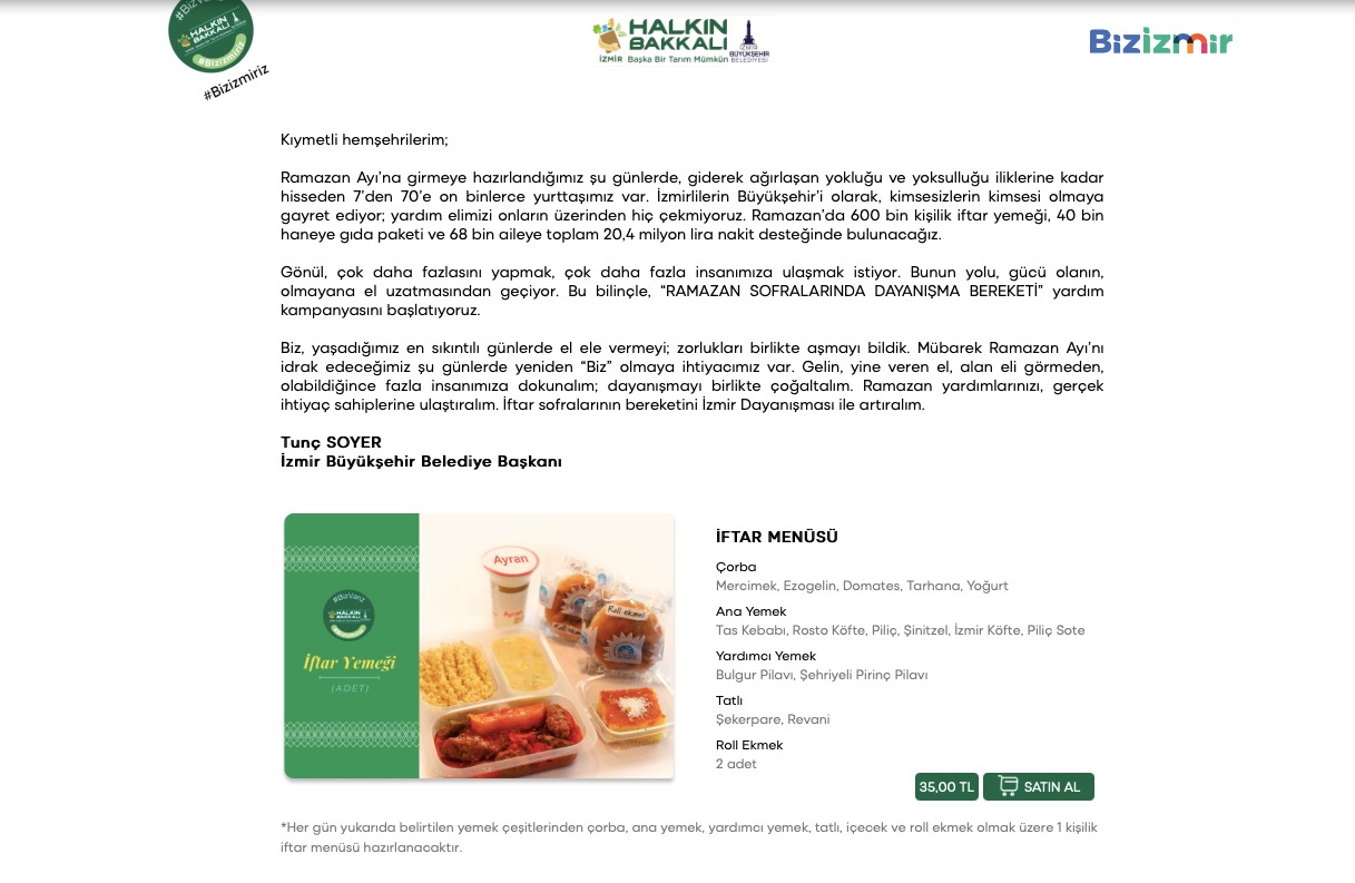 İzmir Büyükşehir Belediye Başkanı Tunç Soyer’in “sosyal belediyecilik” anlayışı doğrultusunda İzmir Büyükşehir Belediyesi giderek ağırlaşan yaşam koşullarına karşı bu Ramazan ayında da iftar bereketini büyütüyor. Büyükşehir Belediyesi Ramazan’da 600 bin kişilik iftar yemeği, 40 bin haneye gıda paketi dağıtacak ve 68 bin haneye hane başına 300’er lira olmak üzere toplam 20 milyon 400 bin lira nakit desteğinde bulunulacak. İftar bereketini büyüterek Ramazan sofralarına destek olmak isteyen yurttaşlar ise Halkın Bakkalı web sitesi üzerinden 35 liralık iftar yemeği satın alabilecek. Satın alınan paketler İzmir Büyükşehir Belediyesi tarafından ihtiyaç sahiplerine ulaştırılacak.