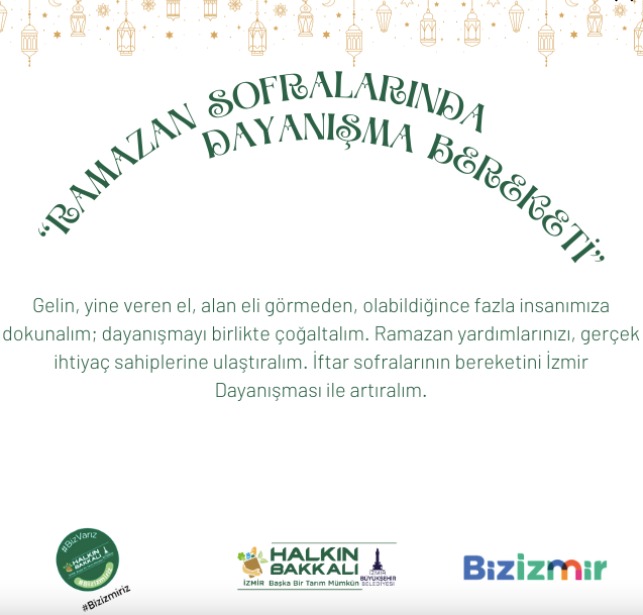İzmir Büyükşehir Belediyesi “Ramazan sofralarında iftar bereketi”ni büyütmek için 600 bin kişilik iftar yemeği ve 40 bin haneye gıda paketi dağıtacak. Büyükşehir Belediyesi 68 bin haneye de toplam 20,4 milyon lira nakit desteğinde bulunacak. Yurttaşlar ise Halkın Bakkalı web sitesi üzerinden 35 liralık yemek ile iftar bereketini büyüterek Ramazan sofralarına destek olabilecek.