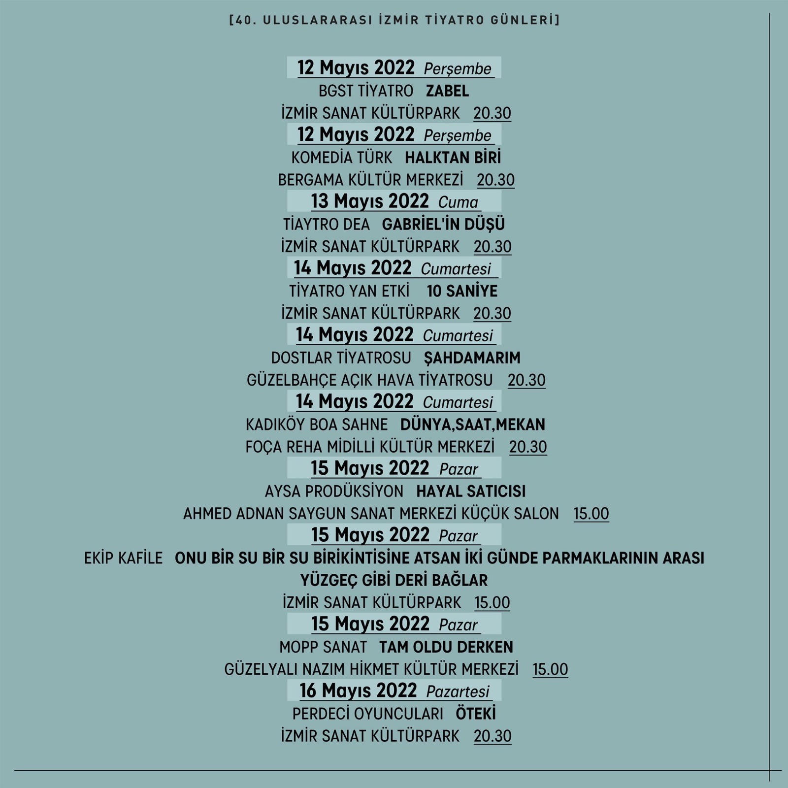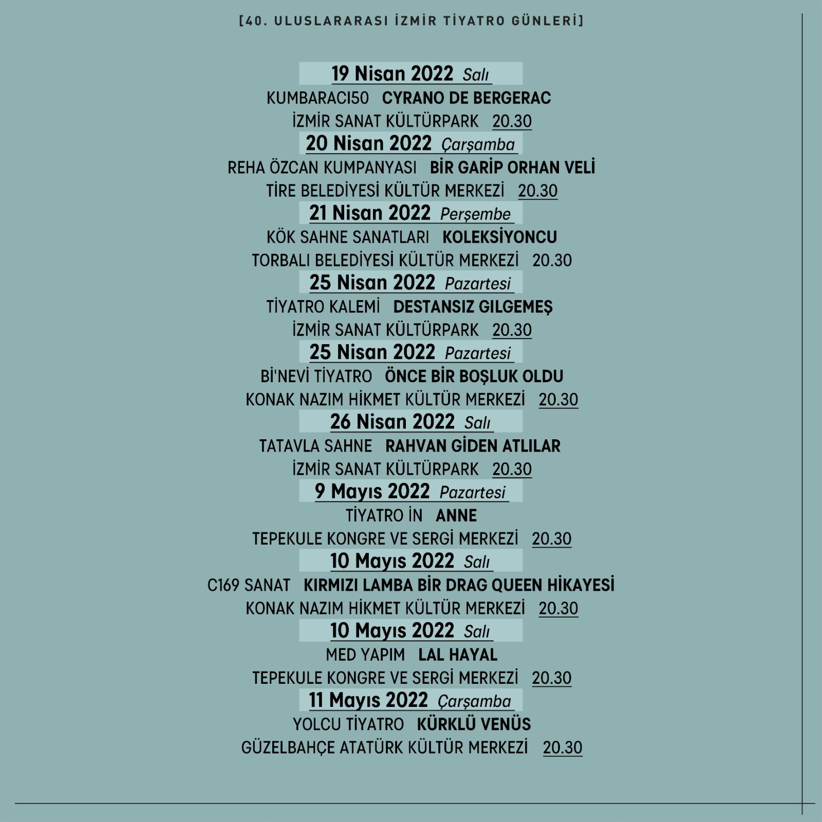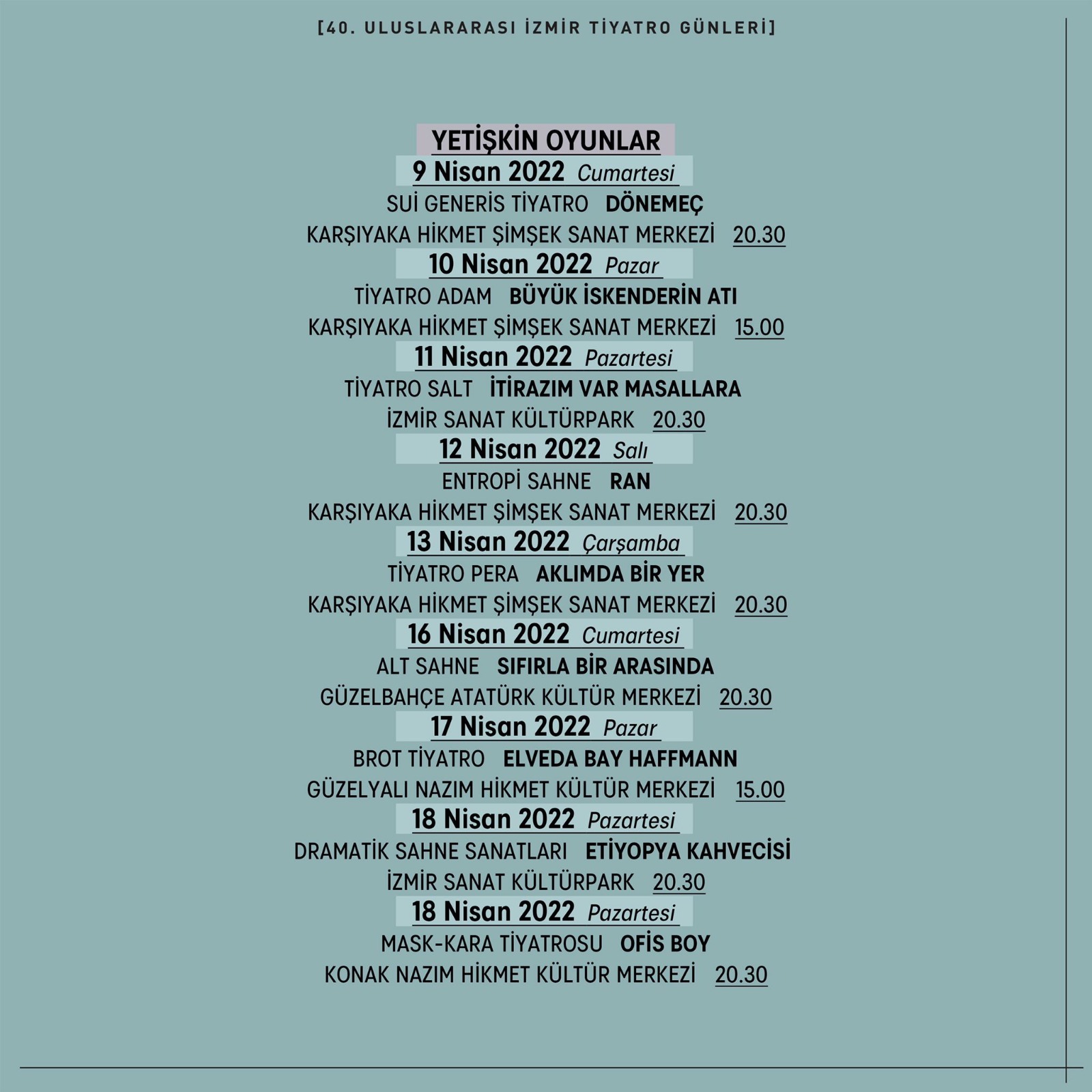 40. yılında 40 ekibe ev sahipliği yapacak ve 17 Mayıs’a kadar sürecek festival kapsamında 30 yetişkin oyunu, 4 uluslararası performans ve 6 çocuk oyunu sergilenecek. Festival sadece İzmir’in merkezinde değil Tire’den Torbalı’ya Bergama’dan Foça’ya birçok ilçede 17 ayrı sahnede tiyatro severlerle buluşacak.