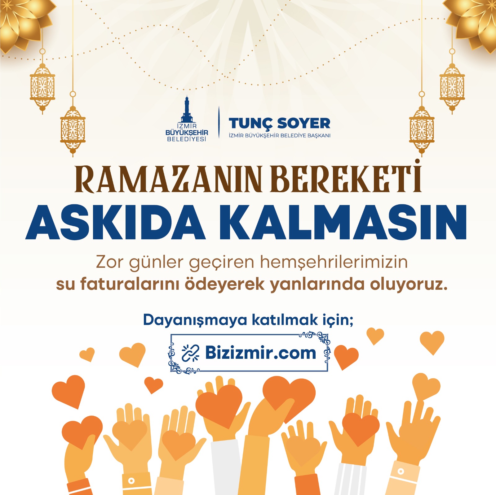 İzmir Büyükşehir Belediyesi ekonomik krizin ağırlaştırdığı yaşam koşulları nedeniyle temel ihtiyaçlarını bile karşılamakta zorlanan ailelere destek olmak için Askıda Fatura uygulamasını yeniden hayata geçirdi. Ramazan ayının dayanışma ruhunun yükseldiği çok özel günler olduğunu ifade eden İzmir Büyükşehir Belediye Başkanı Tunç Soyer tüm İzmirlileri imkanları ölçüsünde kampanyaya destek vermeye çağırarak “İşsizlik ve yoksulluk ülkemizin en büyük problemi. Hayat pahalılığı akıl almaz boyutlara ulaştı. Şimdi yeniden dayanışma zamanı. Maddi sıkıntı yaşayan hemşerilerimizin su faturalarını ödeyerek bu dayanışmayı büyütebiliriz. İnanıyorum ki bu dayanışma bizi ayakta tutacak ve zor günleri bu sayede aşacağız” dedi.